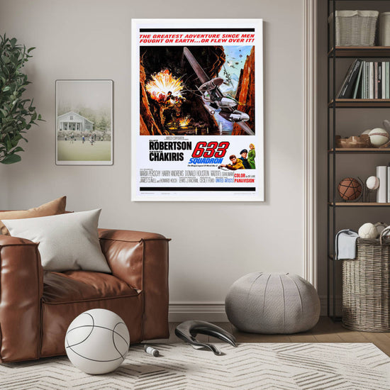 The visual appeal of the "633 Squadron" poster is undeniable, with its dynamic composition featuring bold typography, the squadron's aircraft in mid-flight, and the courageous visage of the lead characters. The vibrant color palette and action-packed imagery evoke the stirring spirit of the film itself and bring the excitement of the on-screen adventure to your walls.