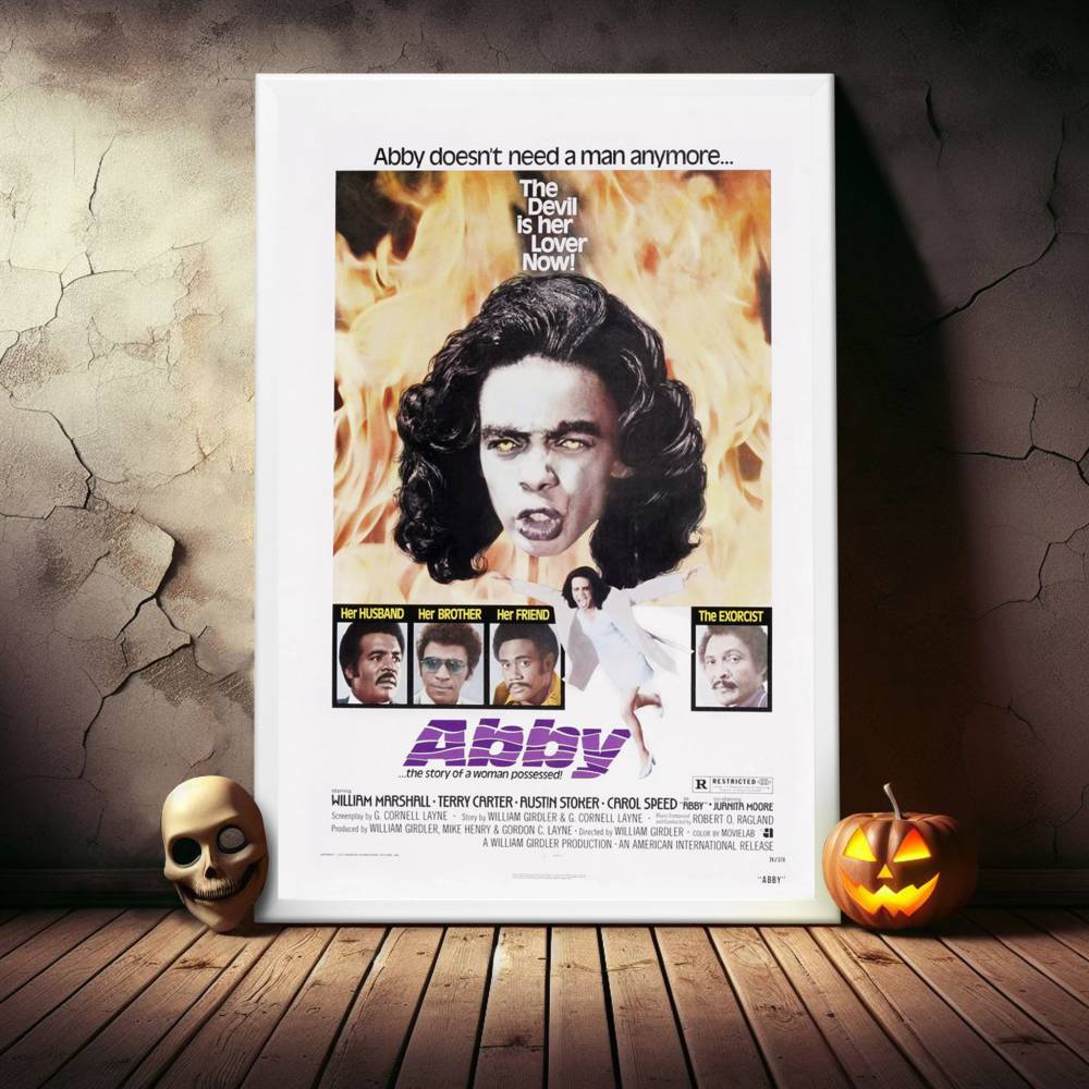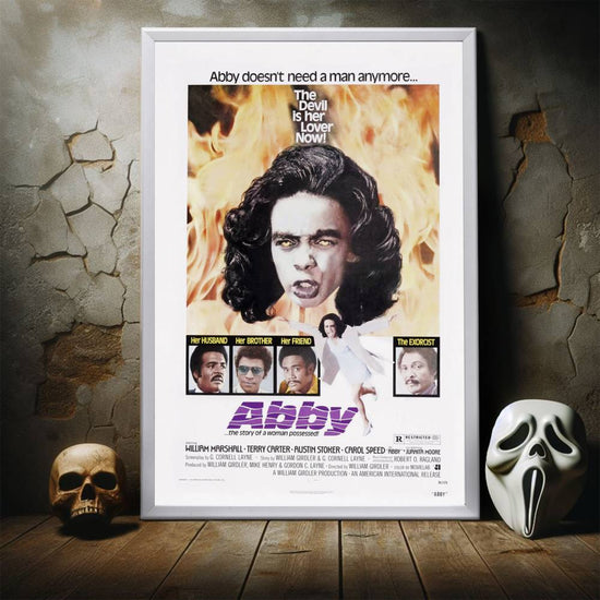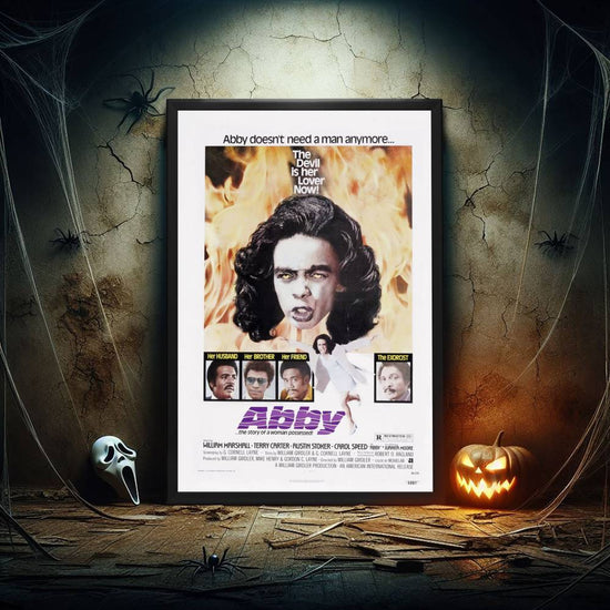 This high-quality reprint pays tribute to the original artwork that lured in 1970s audiences, promising a chilling experience. It's not merely a digital print but a carefully reproduced piece that maintains the integrity and gritty aesthetic of "Abby's" enigmatic visual narrative. The poster showcases the film's central character, Abby, with her eyes ablaze in a fierce yellow, suggesting the possession that drives the film's plot, all set against a backdrop that hints at the spiritual warfare and dark forces at play.