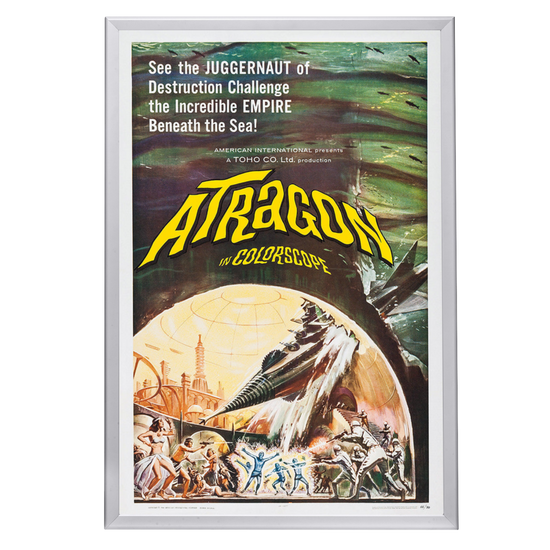 Immerse yourself in the fantastical depths of classic Japanese cinema with this exquisite, high-quality reprint of the 1963 "Atragon" movie poster, framed elegantly in the Snapezo Professional Movie Poster Frame. "Atragon," known for its innovative blend of science fiction and mythology, has captivated audiences with its tale of the legendary super-submarine and its battle against the underwater empire of Mu. This stunning poster captures the essence of the epic adventure and visual spectacle that has made "Atragon" a beloved and critically acclaimed piece of film history.