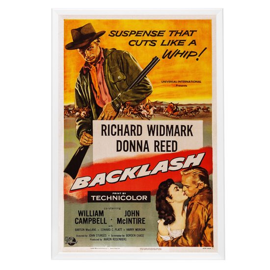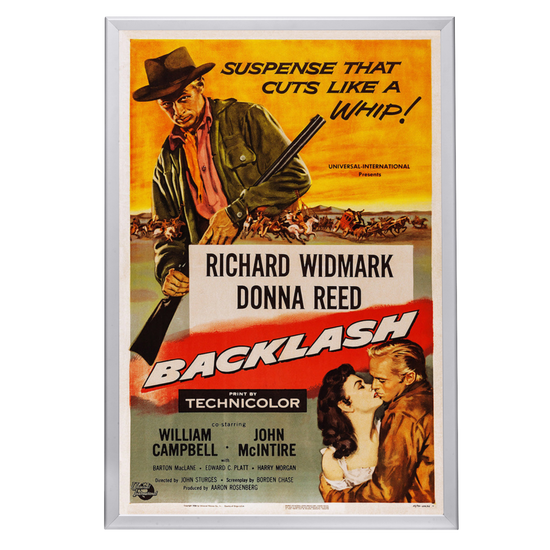 Discover the "Backlash" (1956) framed movie poster, a high-quality reprint in a Snapezo Professional frame with anti-glare. Perfect for Western film enthusiasts.