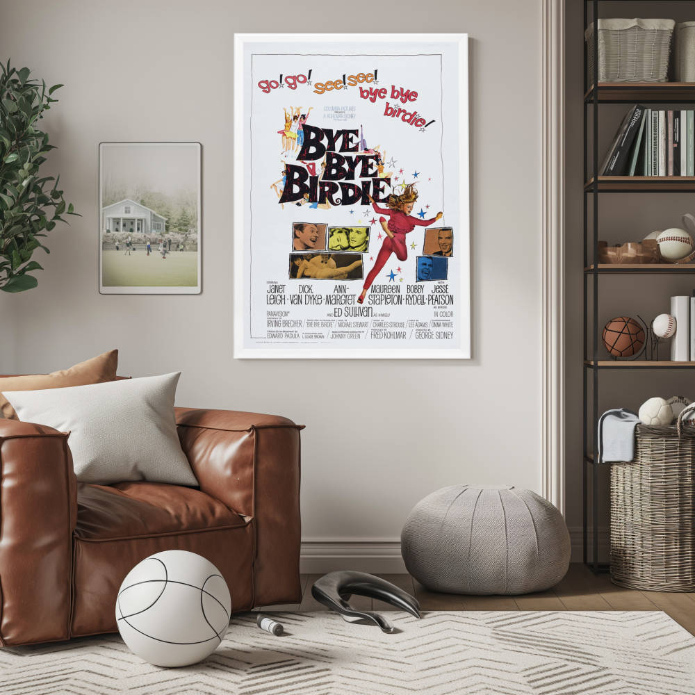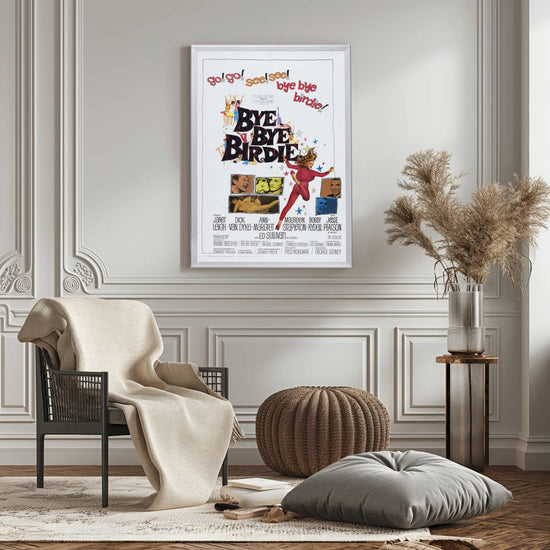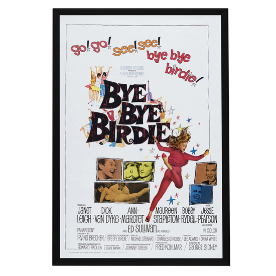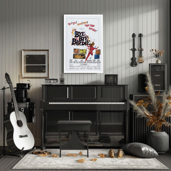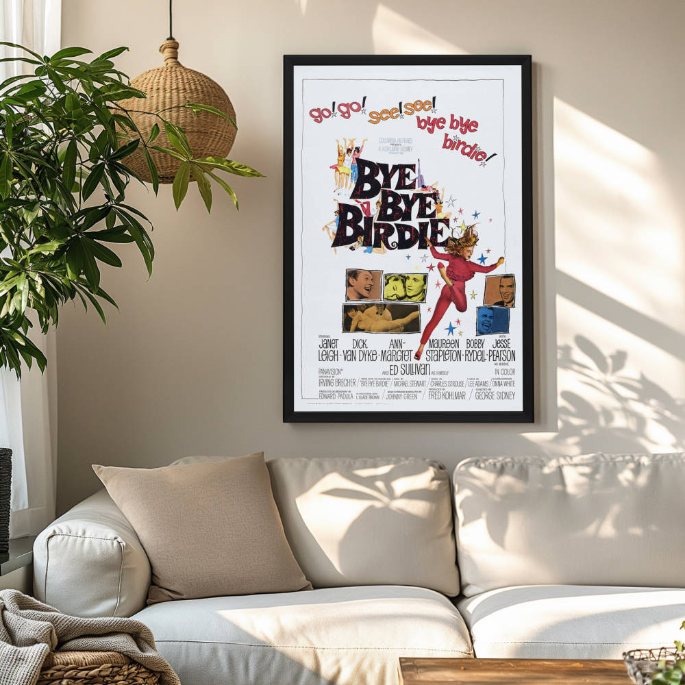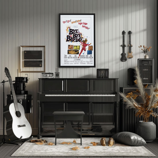 Dive into the vintage charm of the early 60s with the iconic "Bye Bye Birdie" movie poster, now immortalized in a high-quality reprint that captures the essence of this musical comedy's original promotional artwork. Celebrated for its vibrant colors and dynamic illustrations, this poster embodies the exuberance and satirical edge of the film that wowed audiences with its witty commentary on the rock 'n' roll craze.