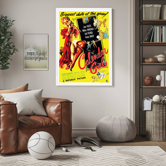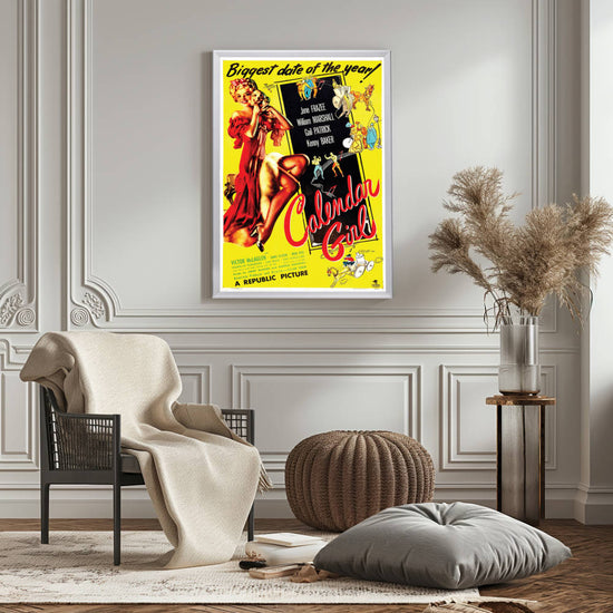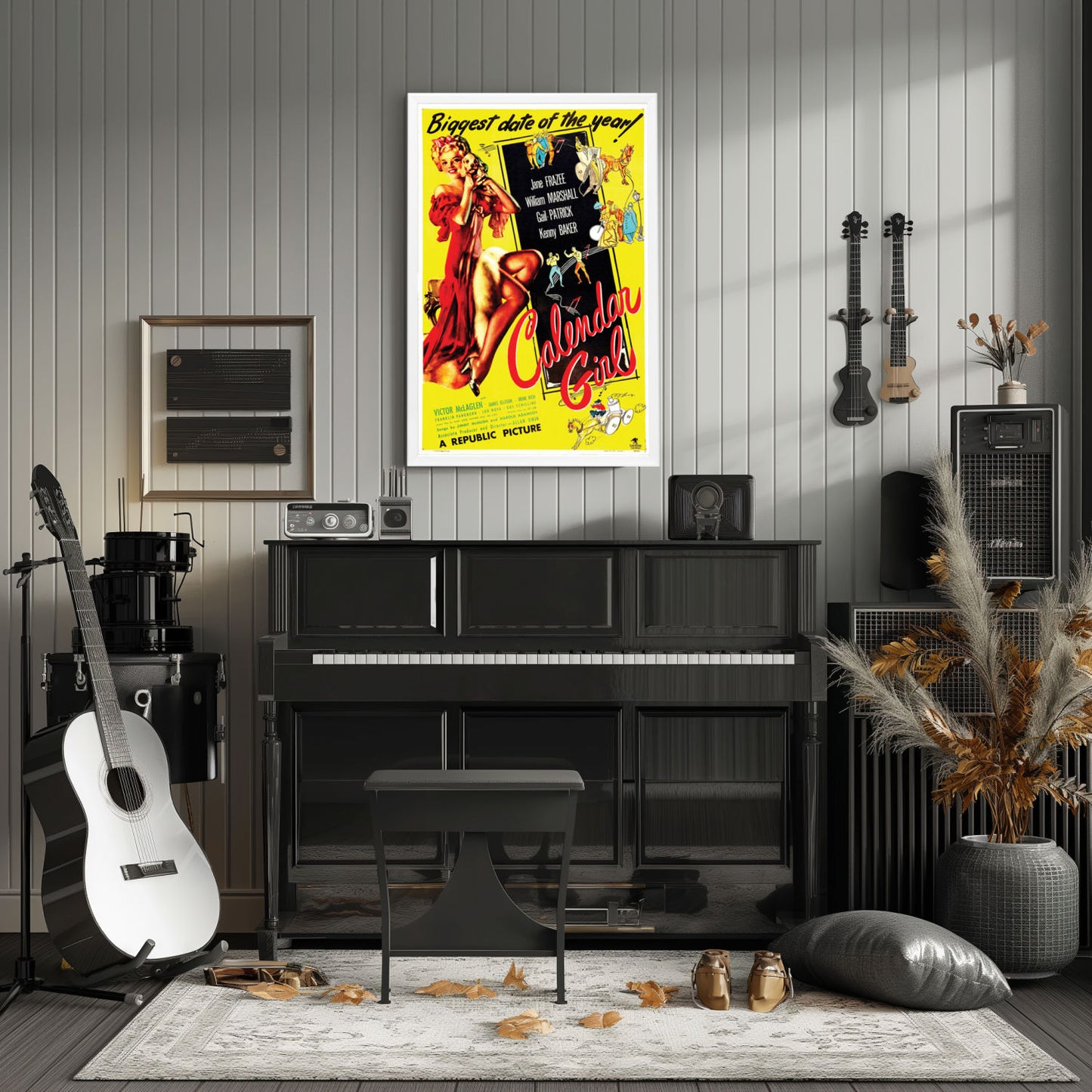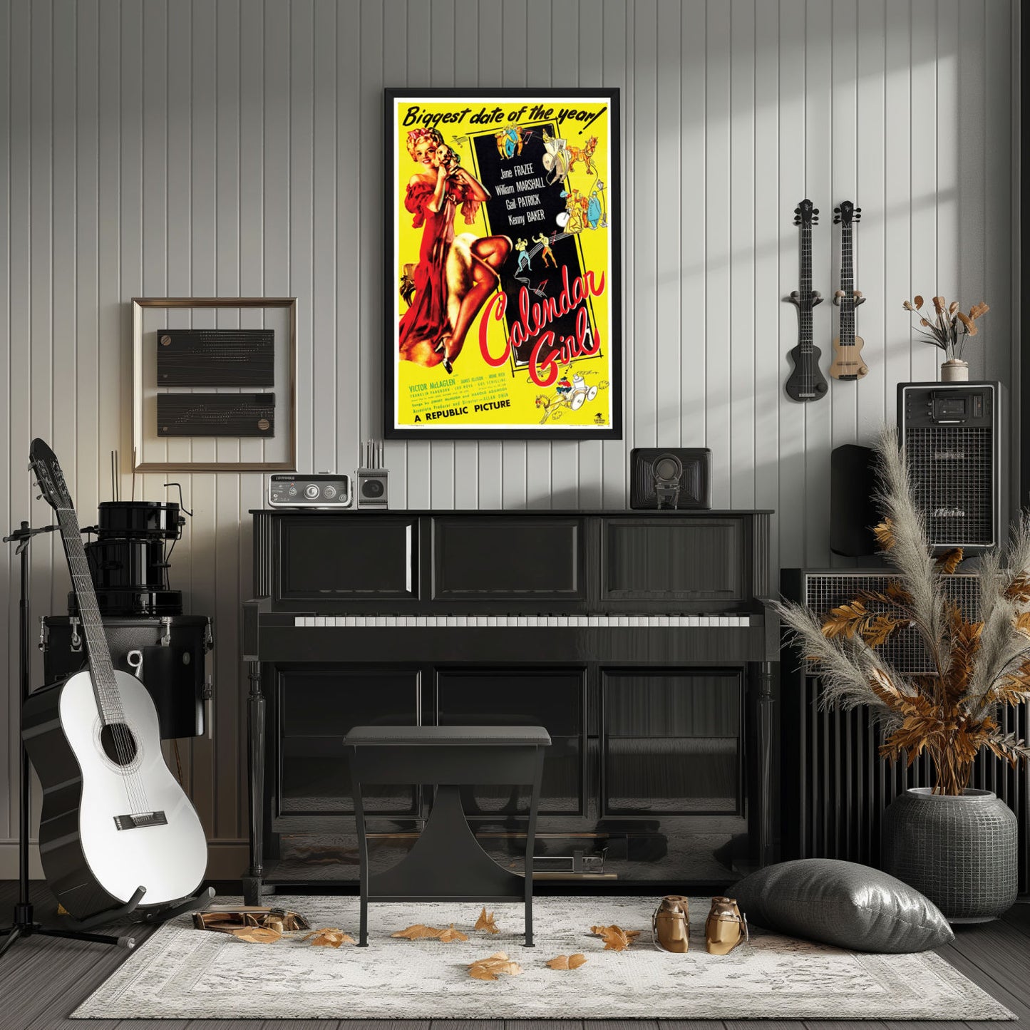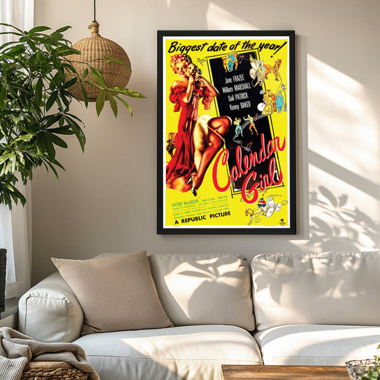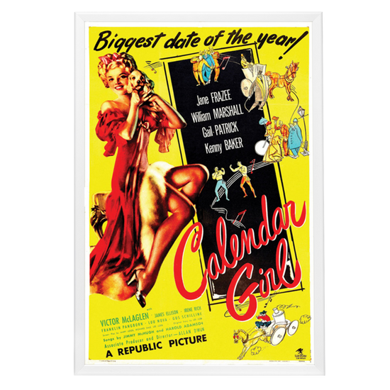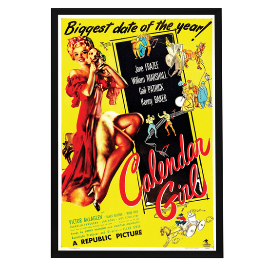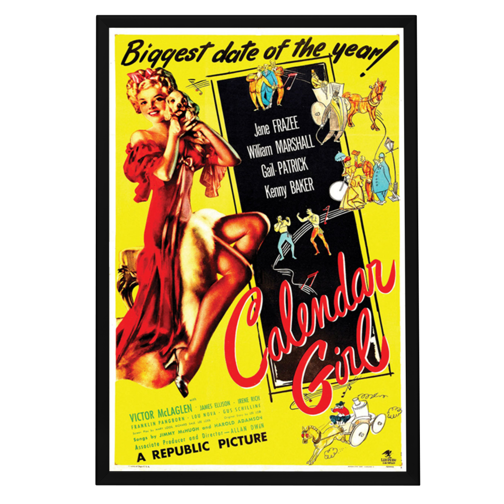 Step back in time and celebrate the charm of Hollywood's yesteryear with a framed reprint of the "Calendar Girl" (1947) movie poster, an underrated gem that has captivated classic film enthusiasts for decades. This quaint, romantic musical, directed by Allan Dwan and featuring the talents of Jane Frazee and William Marshall, provides a warm portrayal of the turn-of-the-century Americana. The film's poster reflects its nostalgic vibe with vibrant, hand-painted artwork that captures the spirit of the era and the innocence of its storytelling.