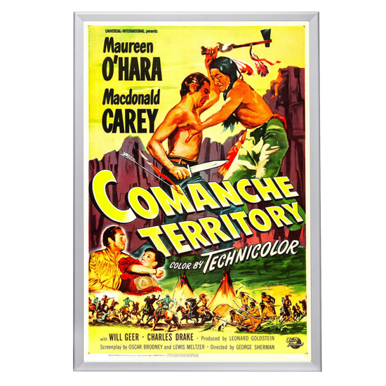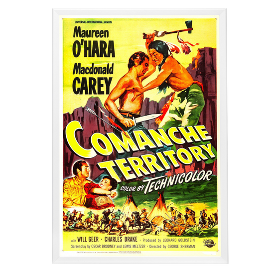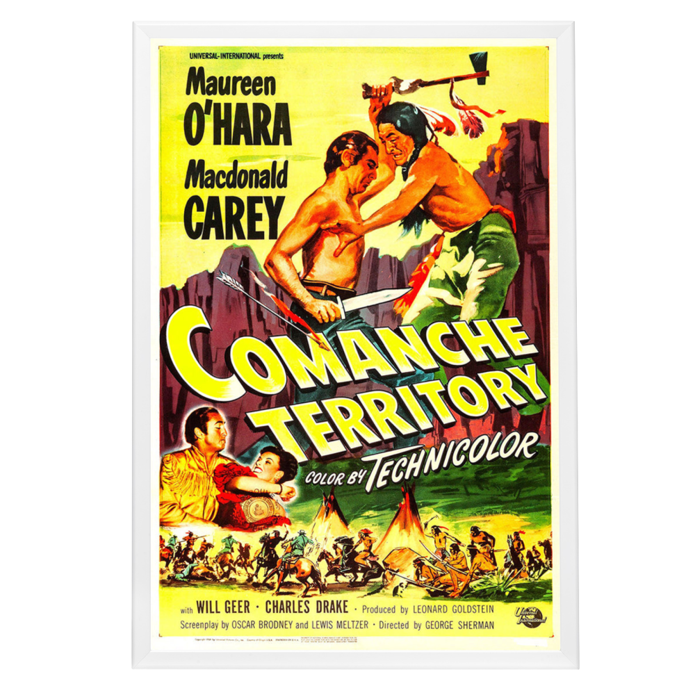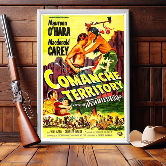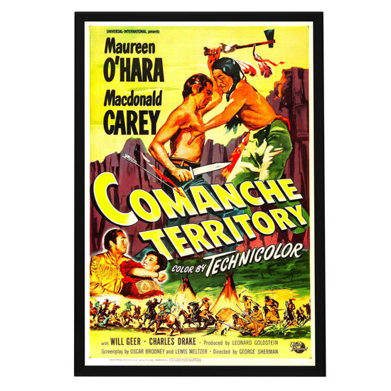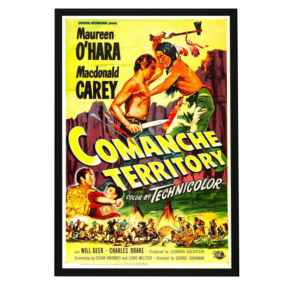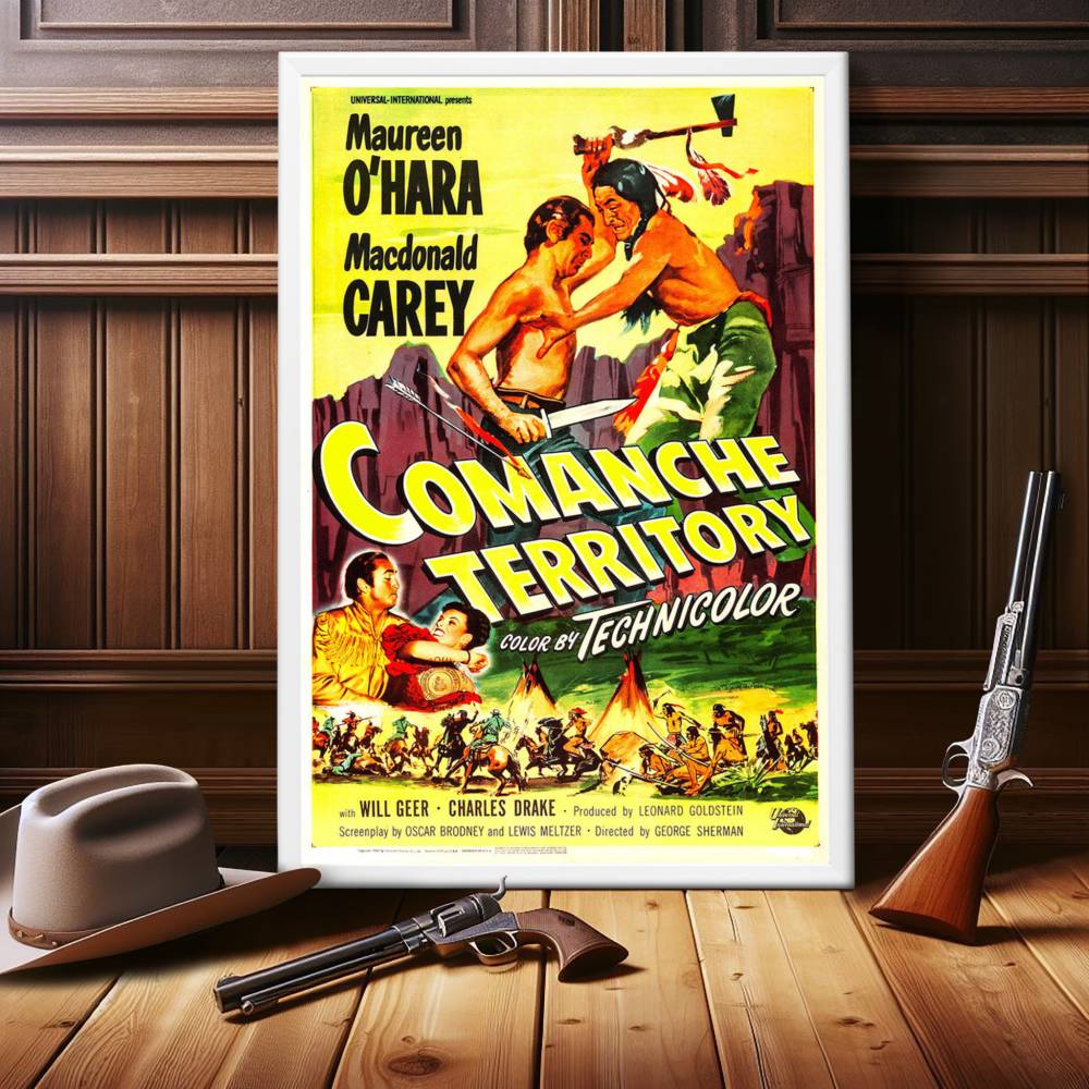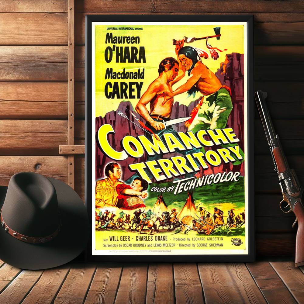 Immerse yourself in the nostalgic allure of classic Western cinema with the framed movie poster of "Comanche Territory" (1950). Celebrate the film that showcased the rugged landscapes of the American frontier and the magnetic performance of silver screen legends like Maureen O'Hara and Macdonald Carey. This vintage piece captures the essence of an era defined by the raw and untamed spirit of the West, and the majestic depiction of Native American culture.