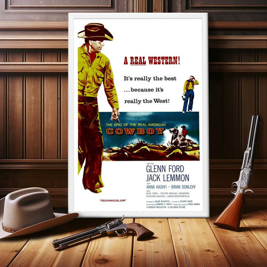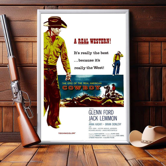 Embark on an authentic journey back to the golden age of Westerns with this exquisite framed movie poster of "Cowboy" (1958). This is not just a piece of movie memorabilia; it's a slice of cinematic history. The poster features the iconic imagery from Delmer Daves' rugged tale of transformation and adventure, resonating with the grandeur of the Old West. The film, starring the legendary Glenn Ford and Jack Lemmon, is a classic that bridged the gap between the golden era and modern Westerns. "Cowboy" is celebrated for its unique blend of authenticity and narrative drive, making this poster a treasured find for collectors and enthusiasts of the genre.