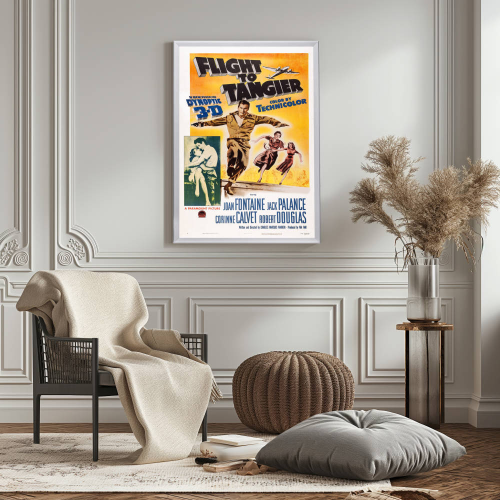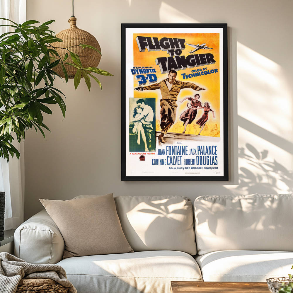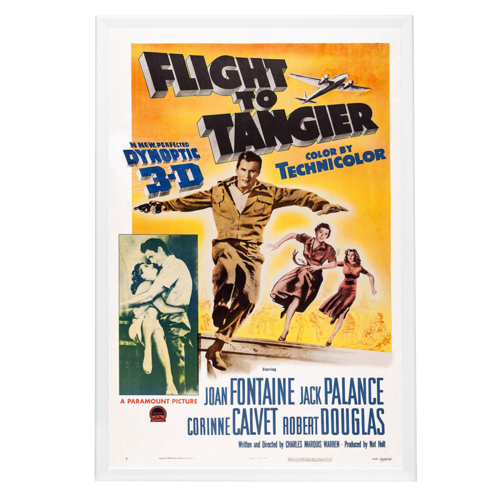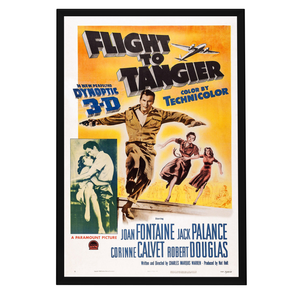 Discover the nostalgia of classic cinema with our framed "Flight to Tangier" (1953) movie poster. This iconic piece of film history captures the essence of the action-packed, Cold War-era intrigue that captivated audiences in the early 50s. Originally starring Jack Palance and Joan Fontaine, the movie's gripping narrative and exotic setting made it a memorable cinematic journey for its viewers.