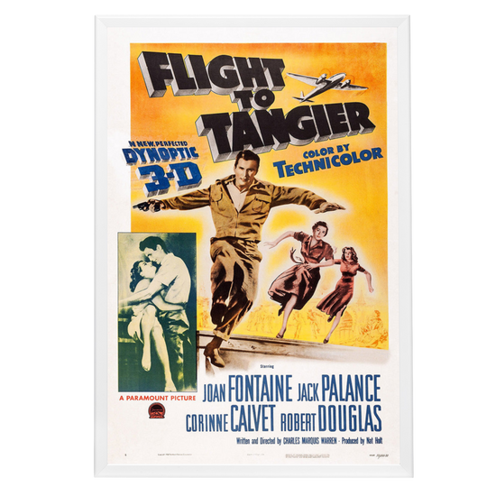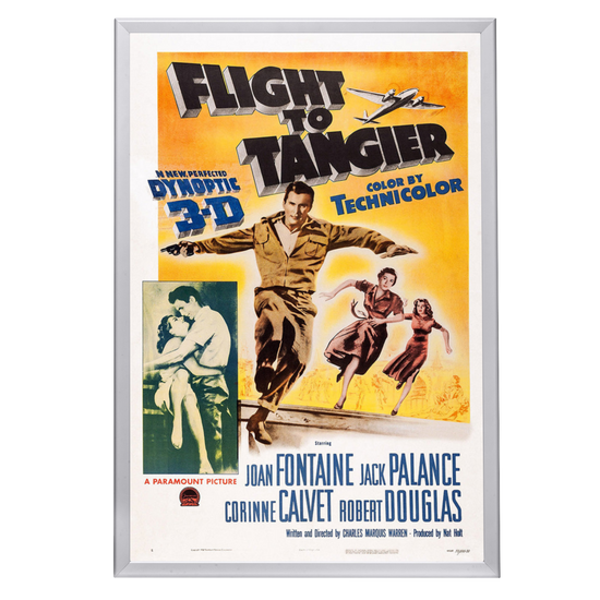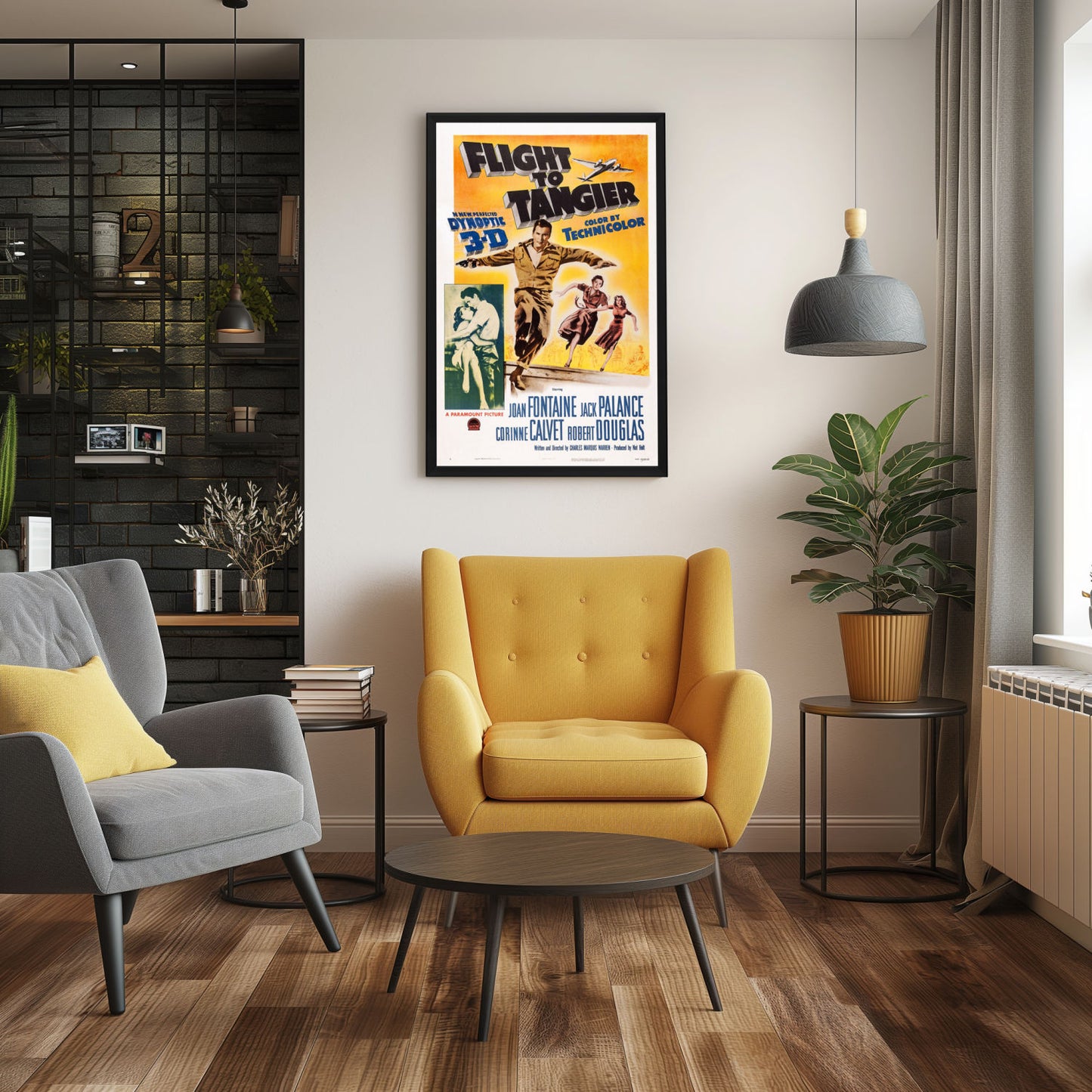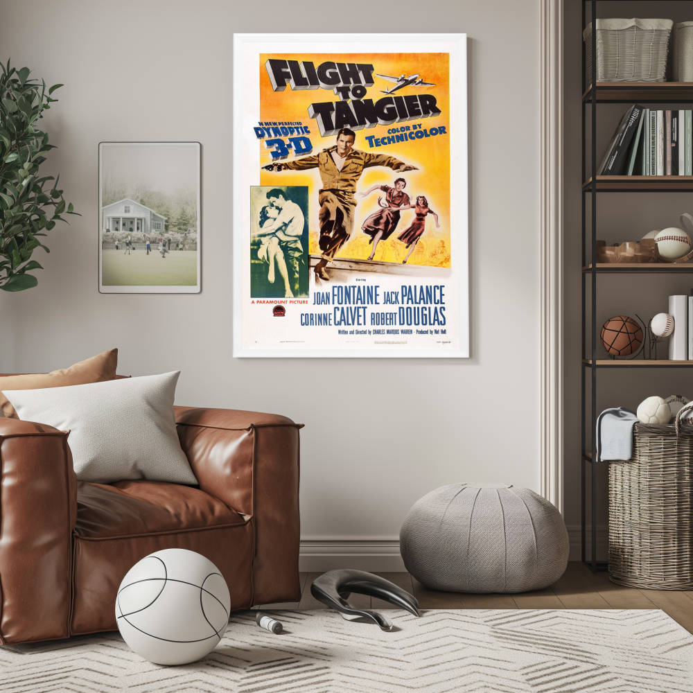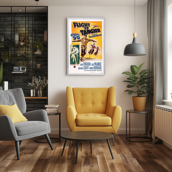 Discover the nostalgia of classic cinema with our framed "Flight to Tangier" (1953) movie poster. This iconic piece of film history captures the essence of the action-packed, Cold War-era intrigue that captivated audiences in the early 50s. Originally starring Jack Palance and Joan Fontaine, the movie's gripping narrative and exotic setting made it a memorable cinematic journey for its viewers.