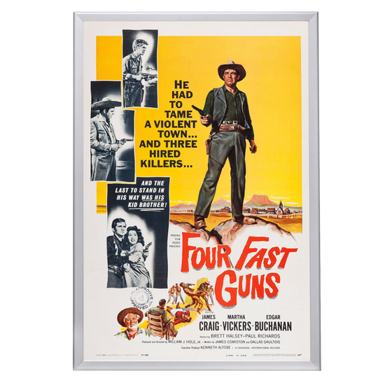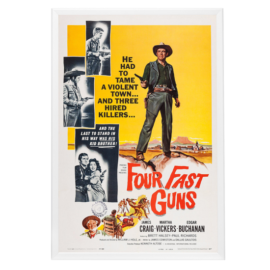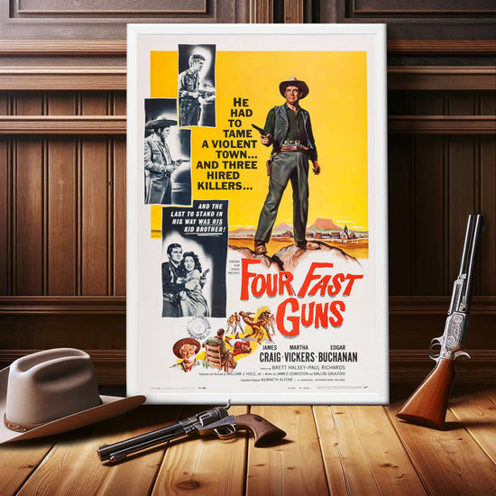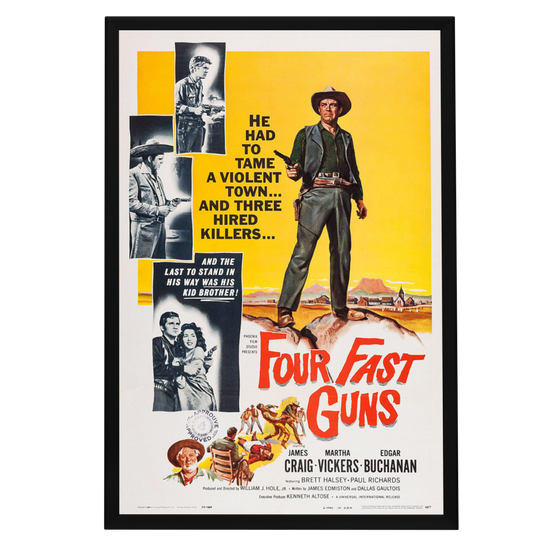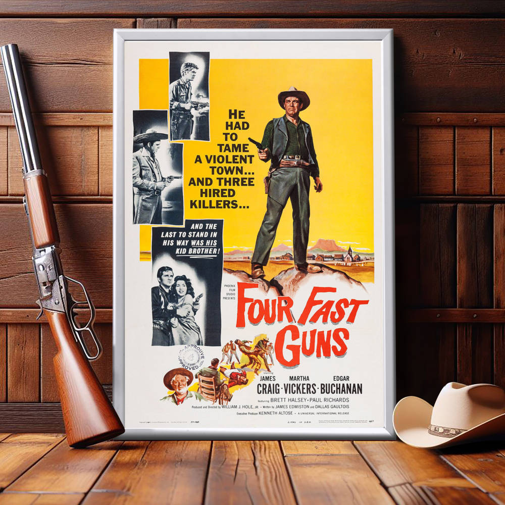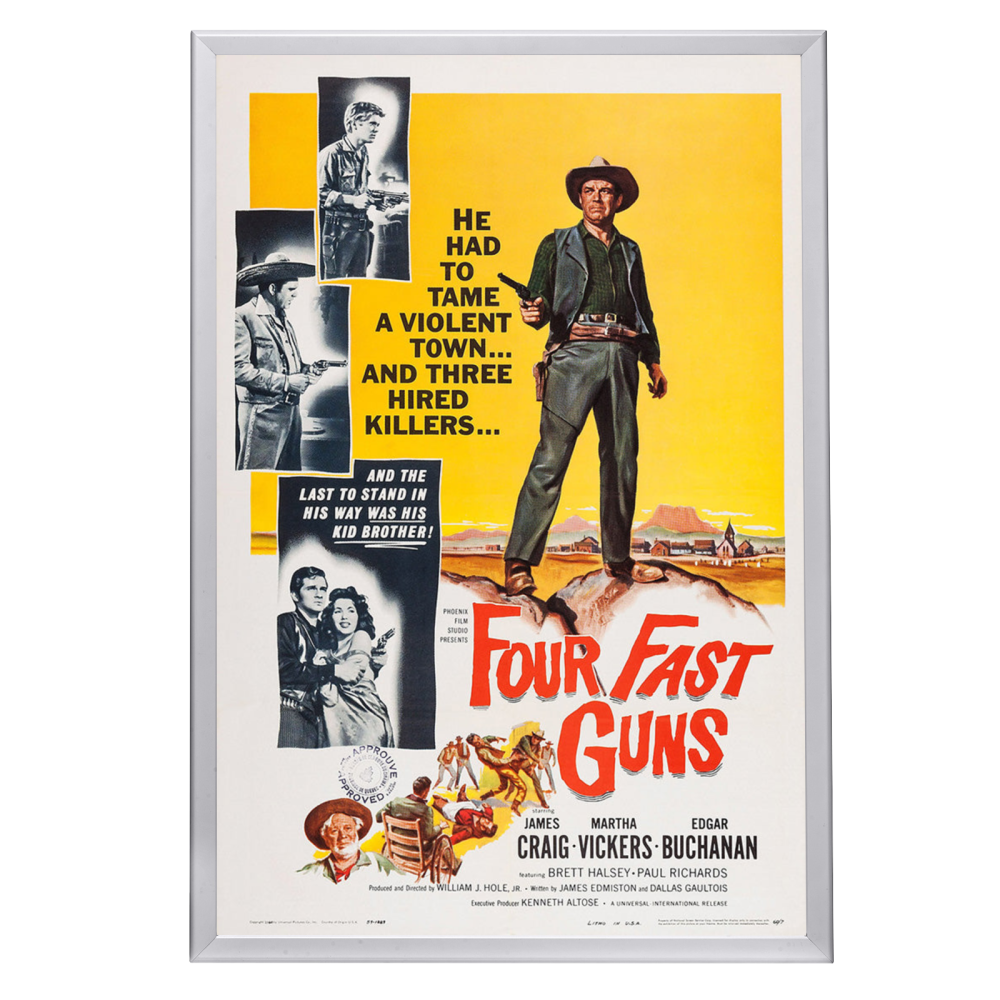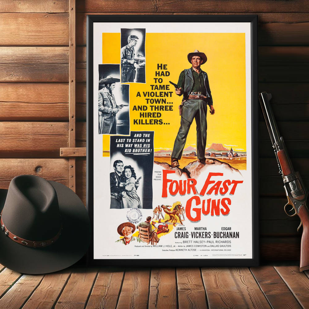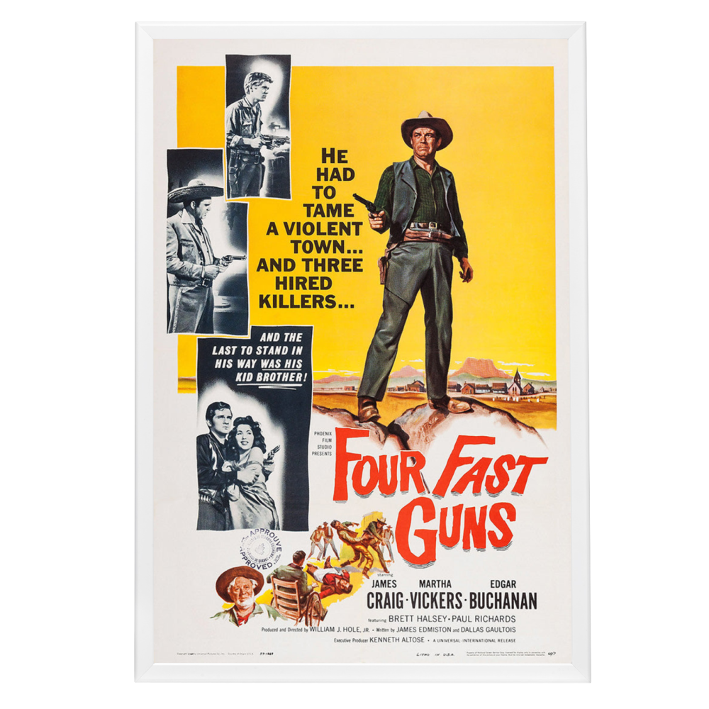 Embrace the wild spirit of the untamed West with the iconic "Four Fast Guns" framed movie poster. This 1960 Western classic, directed by William J. Hole Jr. , featured a star-studded cast led by James Craig and Martha Vickers. The film, known for its gripping storyline and intense shootouts, has left an indelible mark on the Western genre, and now you can bring a piece of that legacy into your home or office.