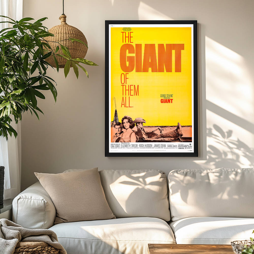 Experience the timeless grandeur of "Giant," the epic 1956 cinematic masterpiece, with our high-quality framed movie poster. The original "Giant" poster has become a collector's item over the years, cherished for its stunning portrayal of the film's iconic trio: Elizabeth Taylor, Rock Hudson, and James Dean. This poster captures the essence of the Texas-sized drama and the emotional intensity that continues to resonate with audiences worldwide, encapsulating the film's themes of love, wealth, and social change.
