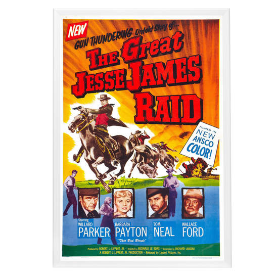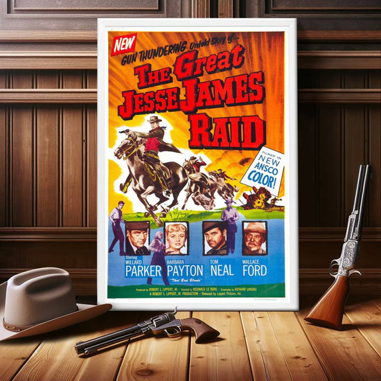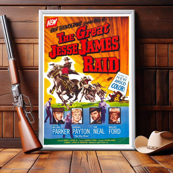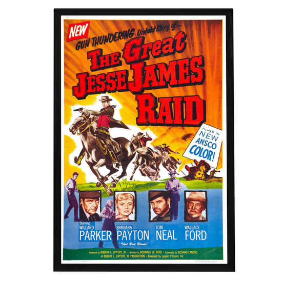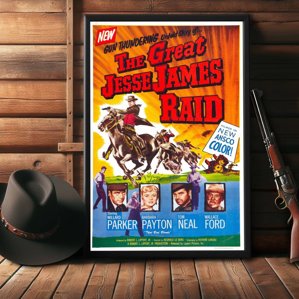 Immerse yourself in the thrilling nostalgia of Western cinema with this exquisitely reproduced movie poster of the "Great Jesse James Raid" from 1953. Celebrate the legacy of this iconic film that captivated audiences with its gripping portrayal of one of the most infamous outlaws in American history. This poster is a testament to the enduring fascination with Jesse James and his daring exploits, which have been immortalized in the annals of classic Westerns.