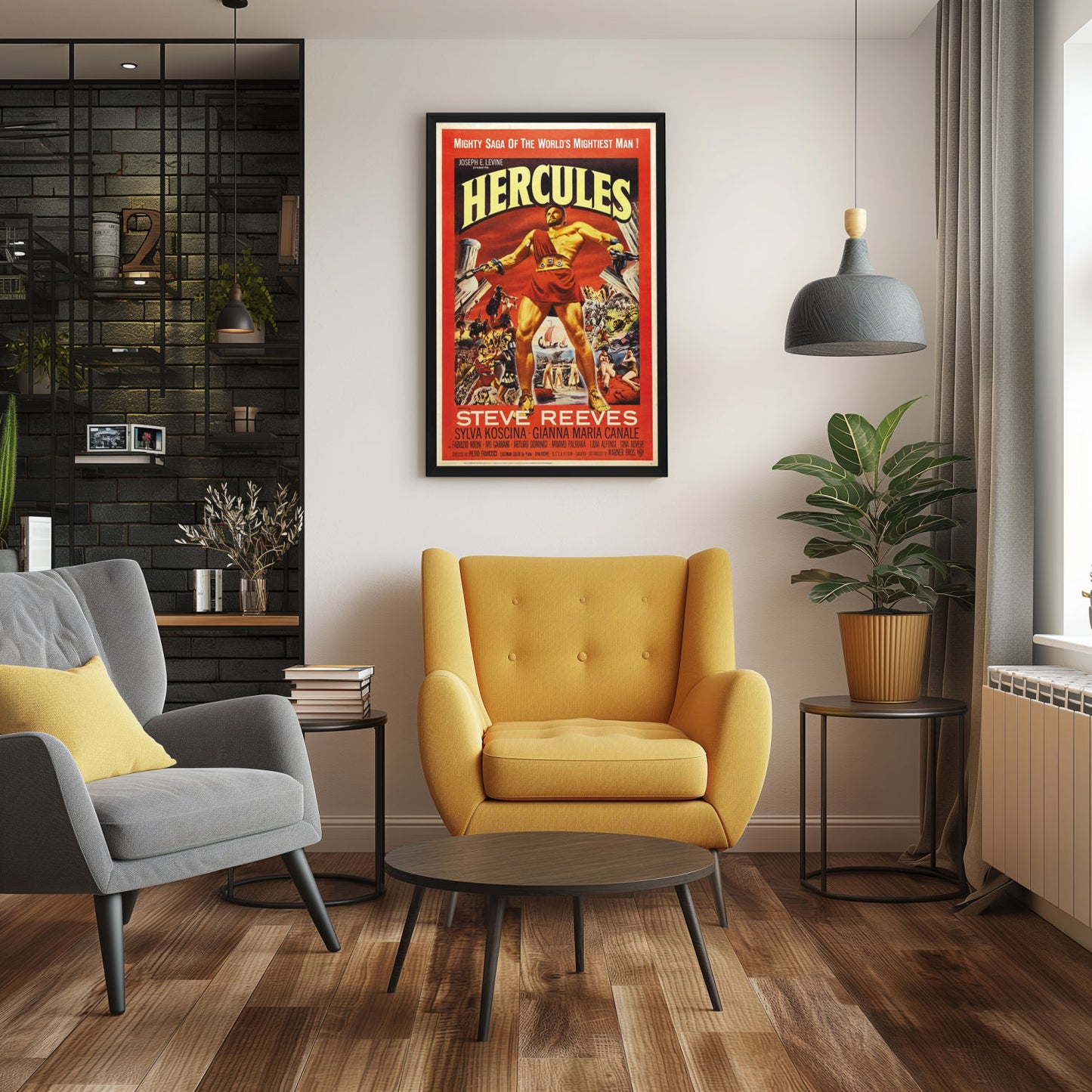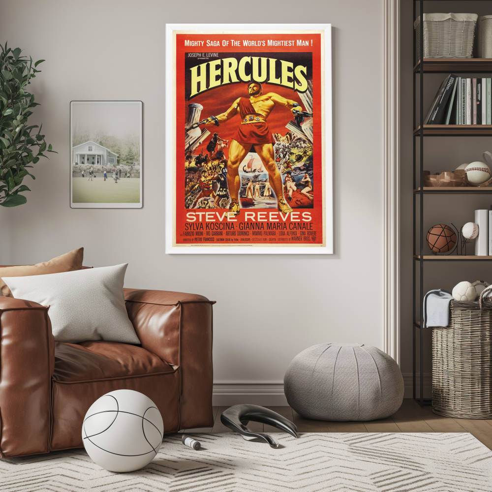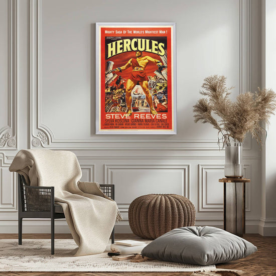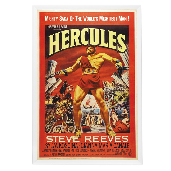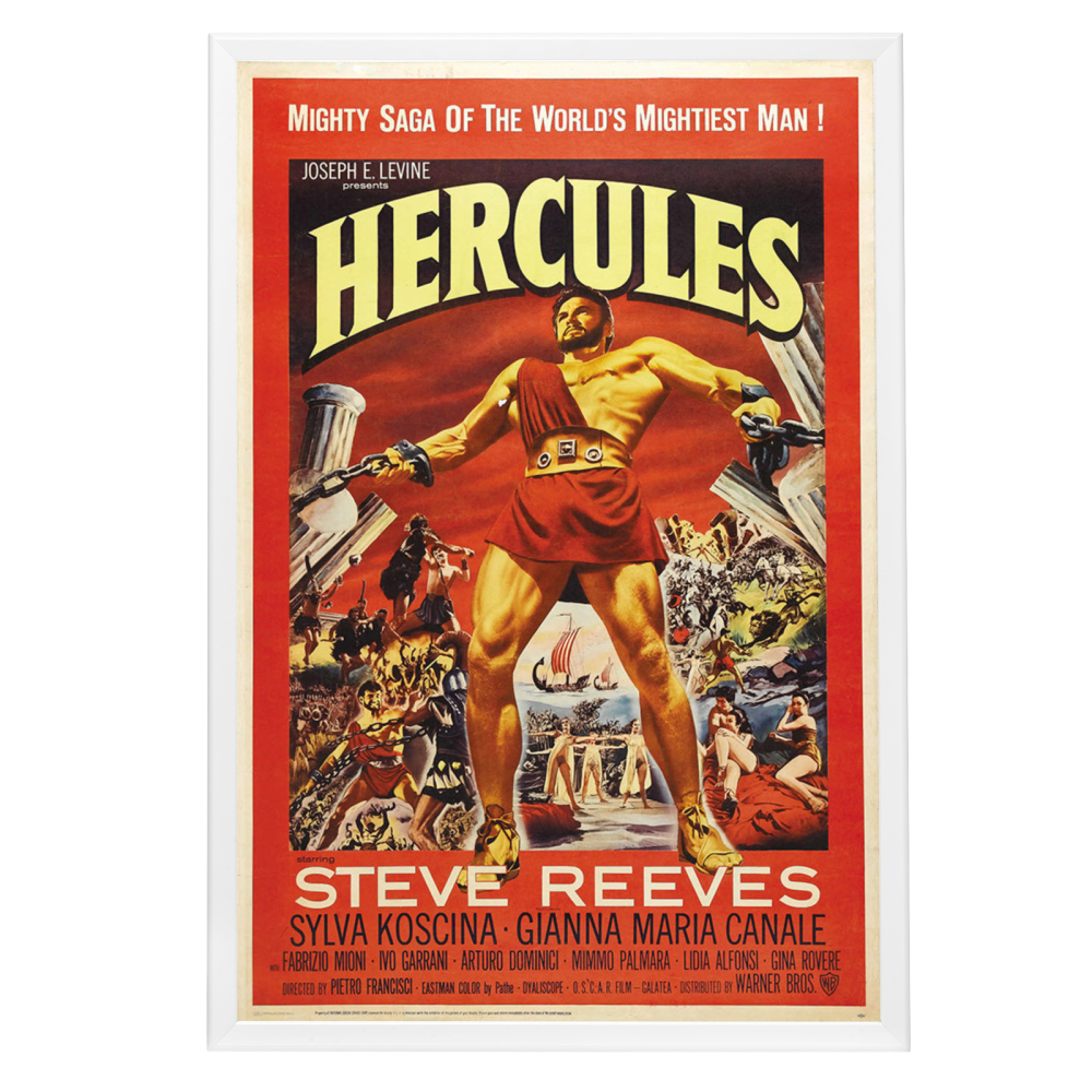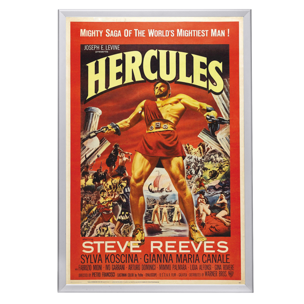 Relive the epic tale with the 'Hercules' 1958 framed movie poster. High-quality reprint in a Snapezo Professional Frame. Perfect for enthusiasts of cinematic legends.