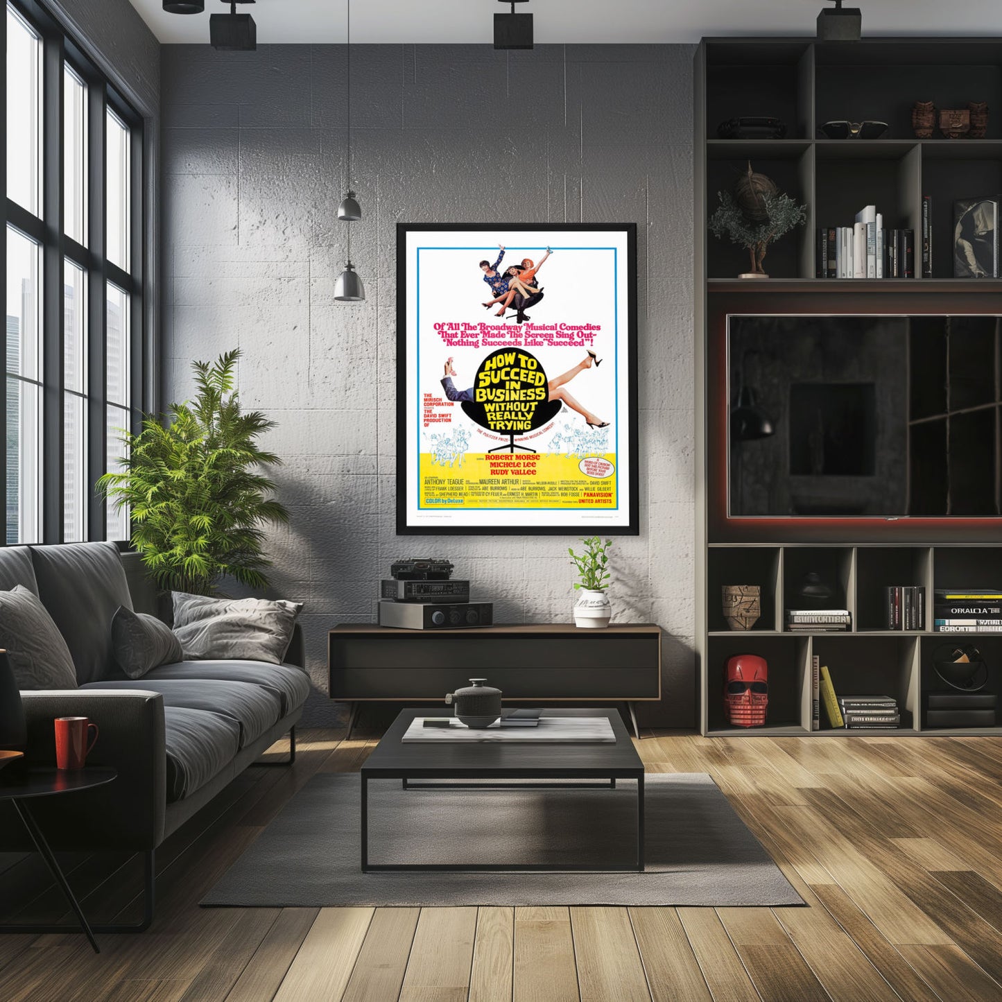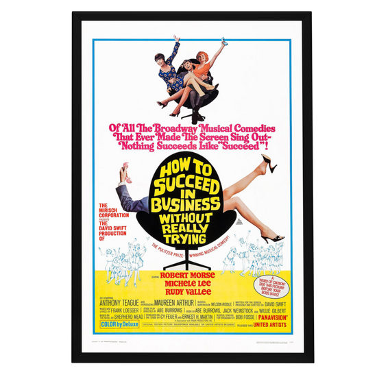 Embrace the vintage charm and ambitious spirit of the 1967 classic with our high-quality framed reproduction of the "How to Succeed in Business Without Really Trying" movie poster. This iconic poster captures the satirical essence of the film, a tongue-in-cheek depiction of the corporate ladder and the humorous journey of J. Pierrepont Finch, portrayed by the charismatic Robert Morse.
