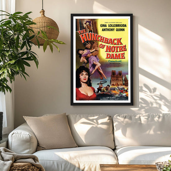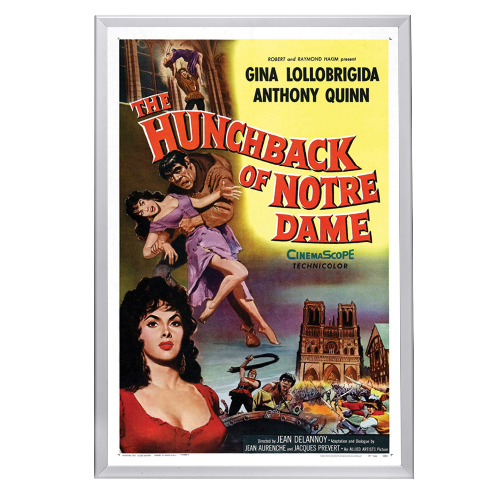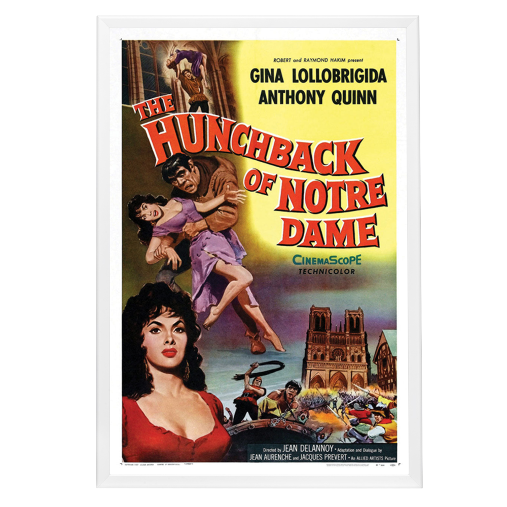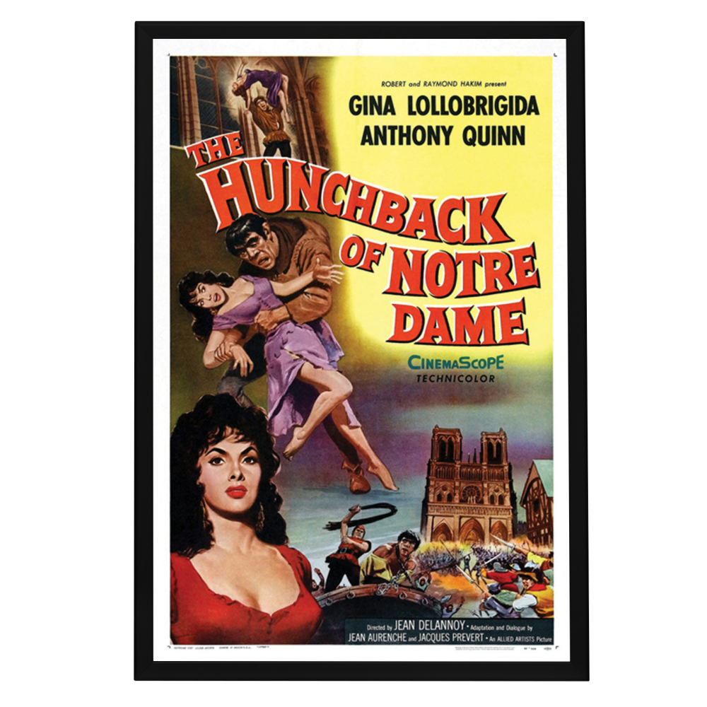Unveil the majesty of cinematic history with our exquisite framed movie poster of the 1956 classic, "The Hunchback of Notre Dame. " This timeless masterpiece, which has captured the hearts of audiences worldwide, is revered for its compelling adaptation of Victor Hugo's 1831 novel. The film, featuring a stirring performance by Anthony Quinn as Quasimodo and the enchanting Gina Lollobrigida as Esmeralda, has left an indelible mark on the silver screen with its gothic romance and dramatic intensity.