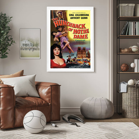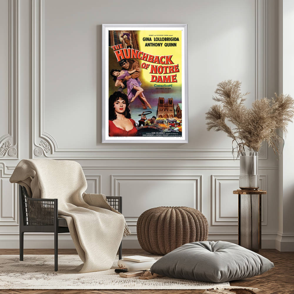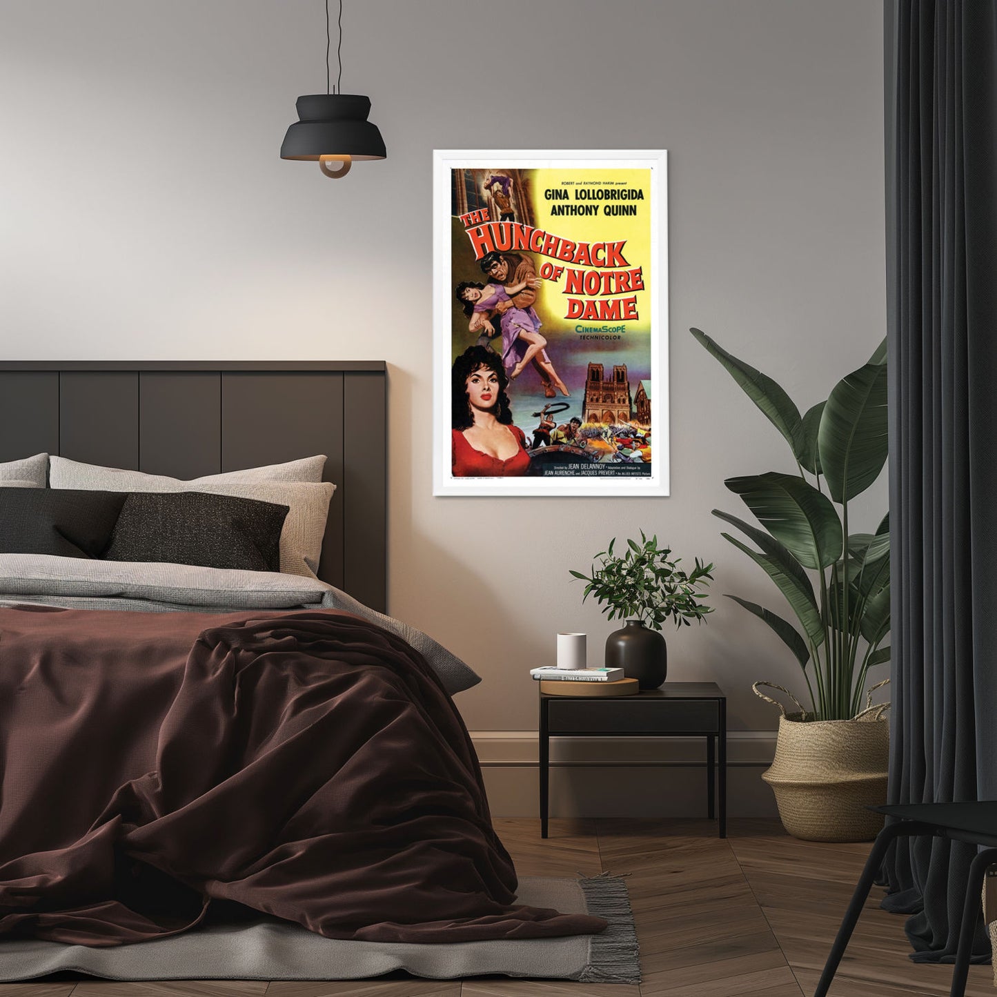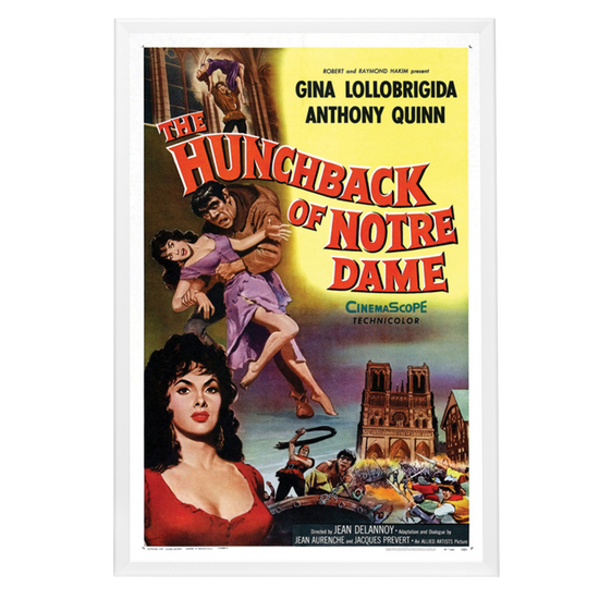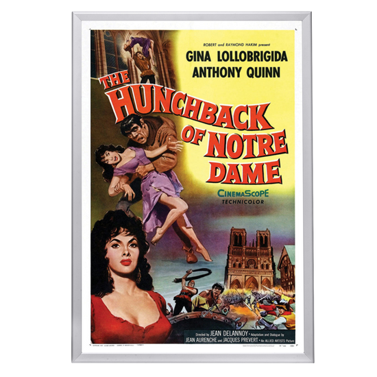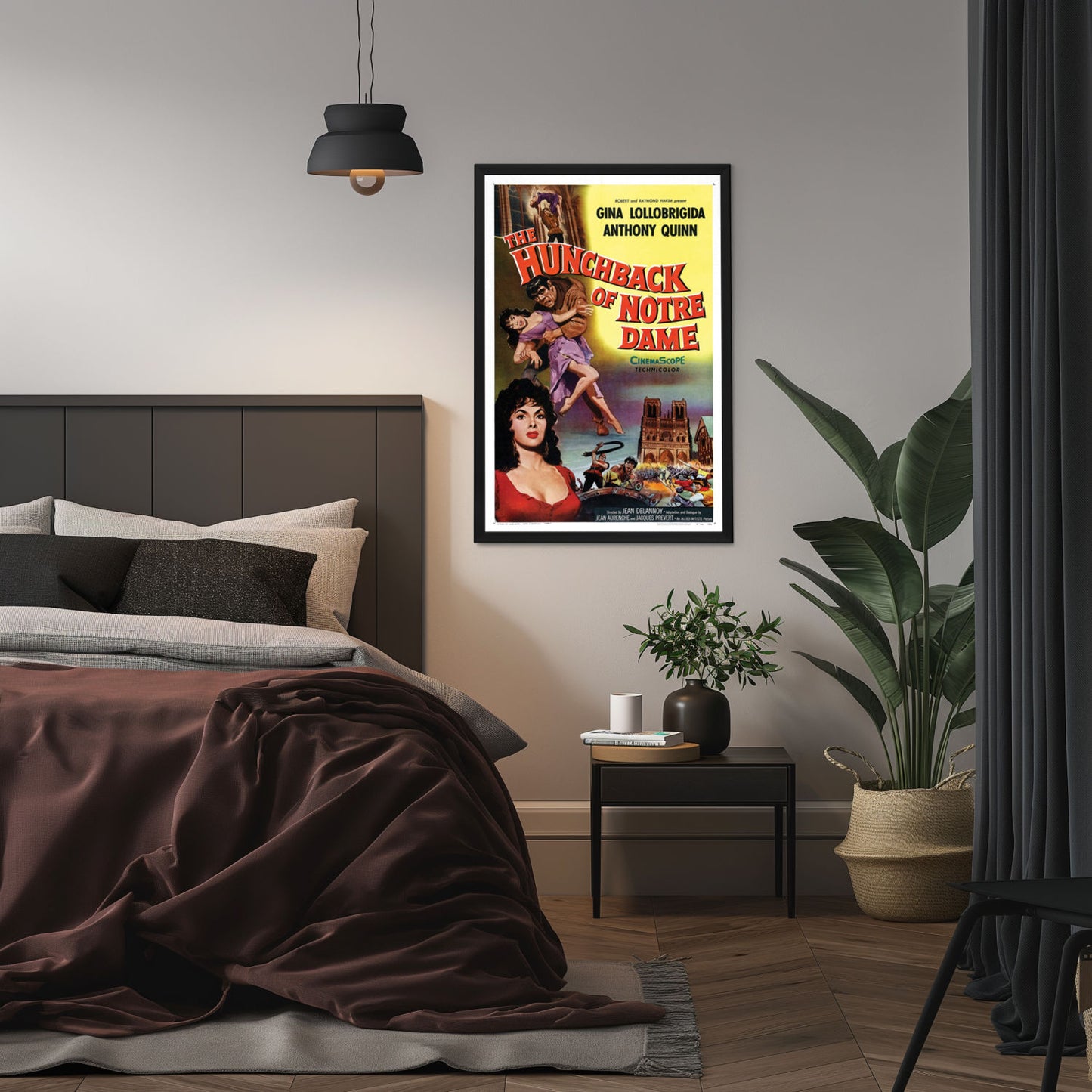 Unveil the majesty of cinematic history with our exquisite framed movie poster of the 1956 classic, "The Hunchback of Notre Dame. " This timeless masterpiece, which has captured the hearts of audiences worldwide, is revered for its compelling adaptation of Victor Hugo's 1831 novel. The film, featuring a stirring performance by Anthony Quinn as Quasimodo and the enchanting Gina Lollobrigida as Esmeralda, has left an indelible mark on the silver screen with its gothic romance and dramatic intensity.
