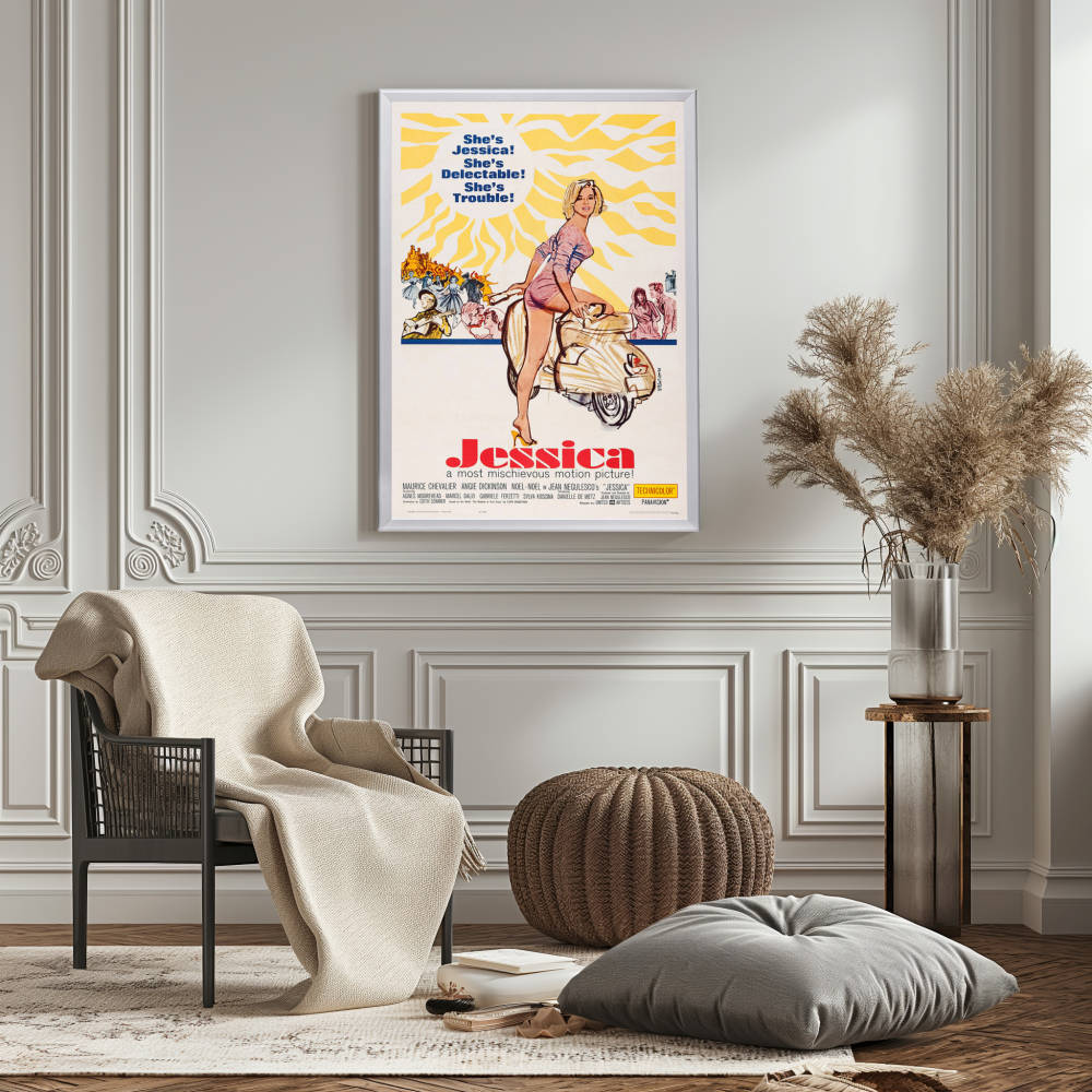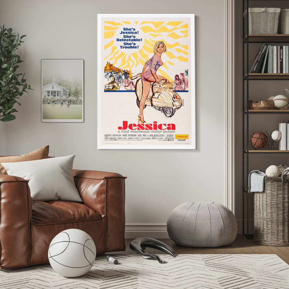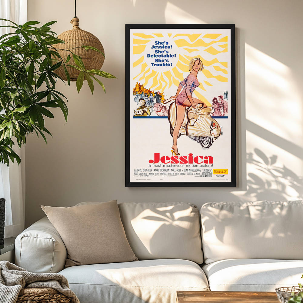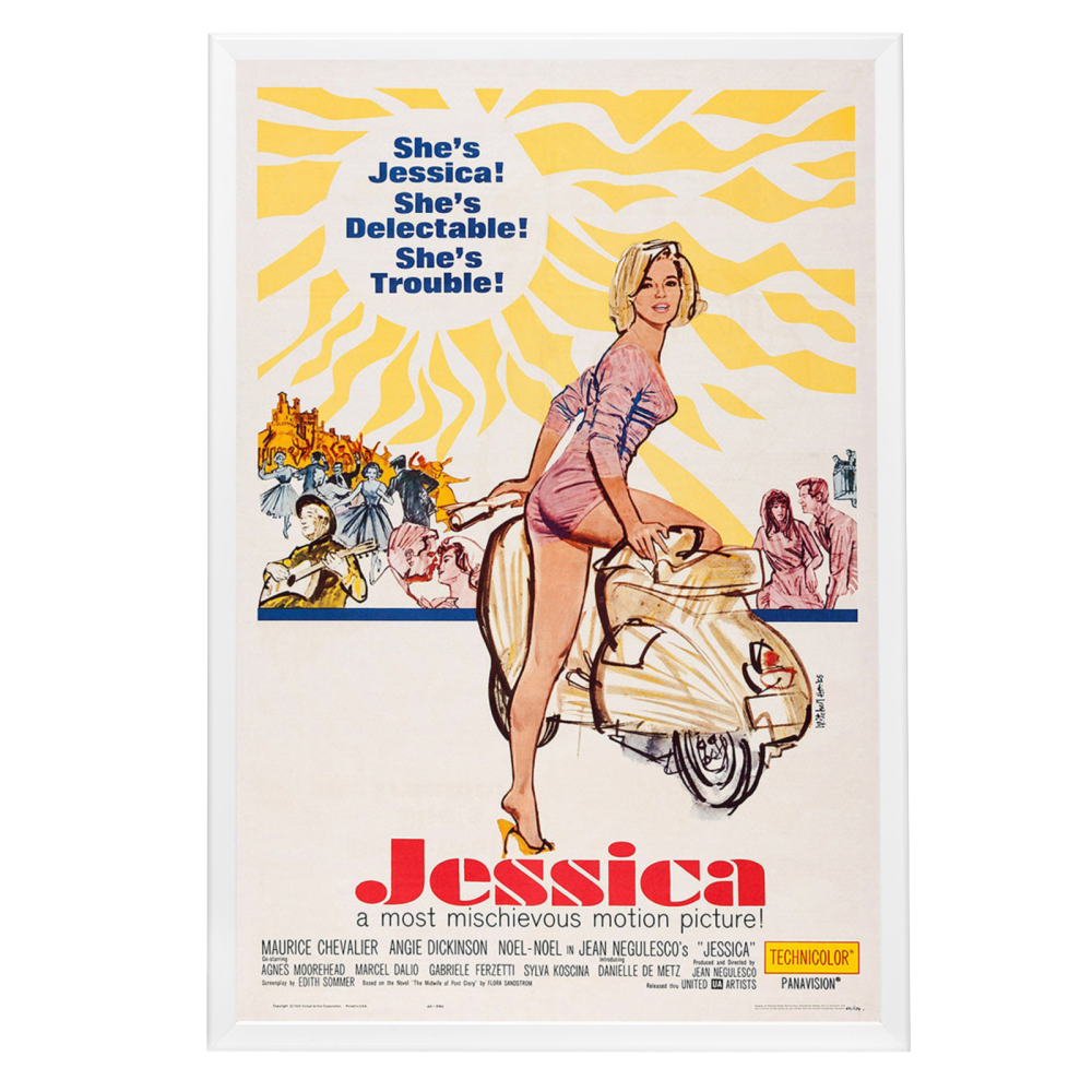 Embrace the cinematic elegance of the 1962 classic "Jessica" with a museum-quality framed movie poster. This exquisite piece of film history, featuring the vivid and iconic artwork that originally graced theater lobbies, captures the essence of an era with its lush, pastoral imagery and the allure of stars like Angie Dickinson and Maurice Chevalier.