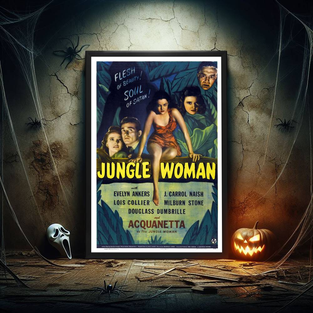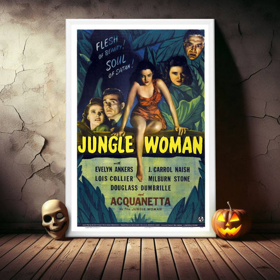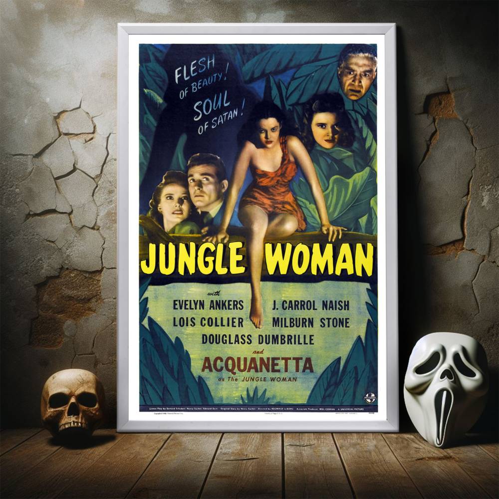 Immerse yourself in the eerie allure of the classic 1944 horror film, "Jungle Woman," with this high-quality reprint of the original movie poster. Known for captivating audiences with its chilling narrative of a mysterious female creature, this film poster has become a sought-after piece for collectors and enthusiasts of the genre. The artwork, synonymous with the era's unique style, features bold, suspenseful imagery that embodies the film's dark themes and the Golden Age of Hollywood horror.