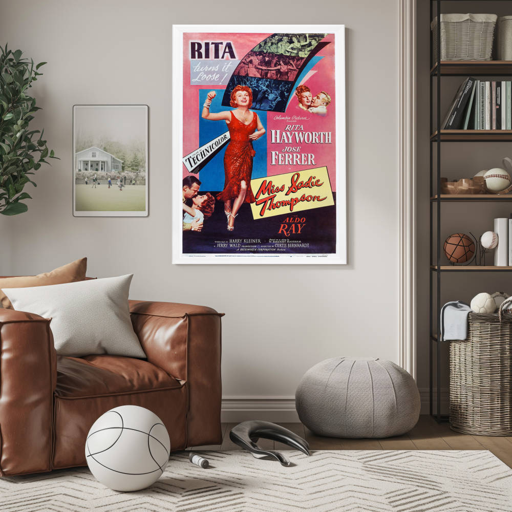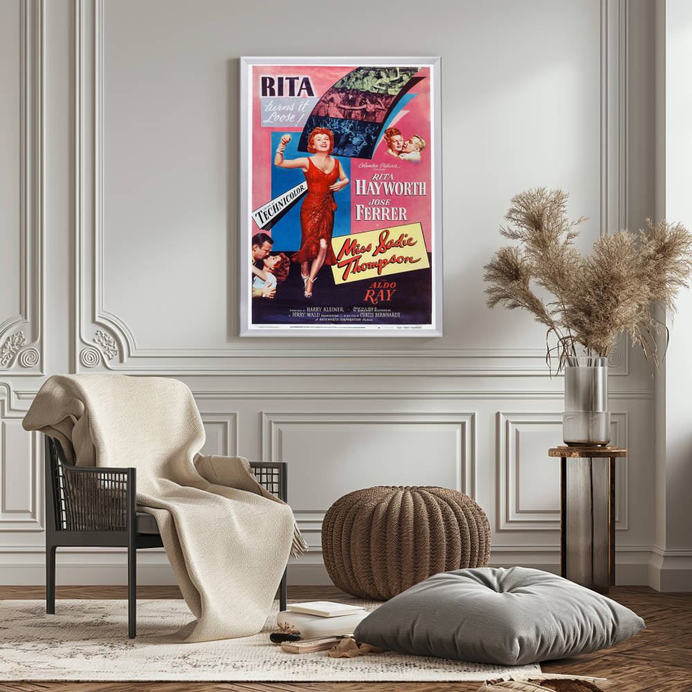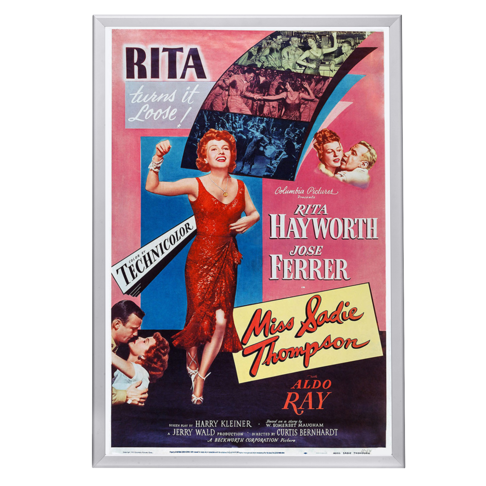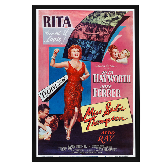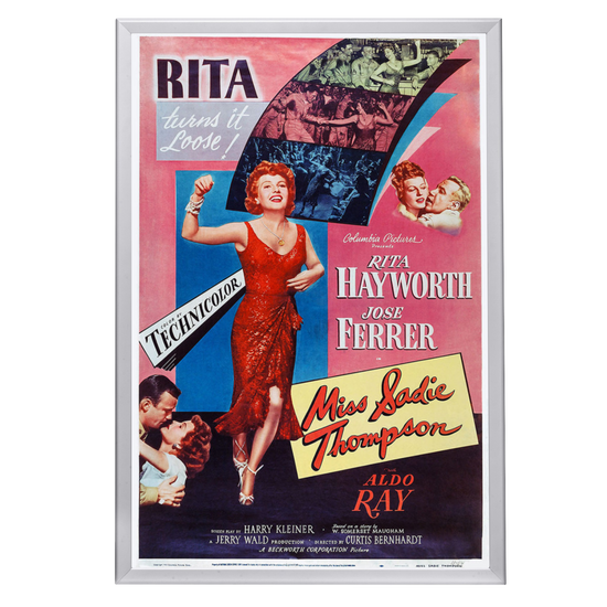 Experience the allure of Rita Hayworth with the framed Miss Sadie Thompson poster in a high-quality Snapezo frame. Classic art meets modern display.