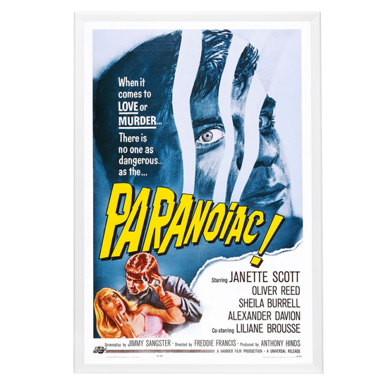 Immerse yourself in the chilling atmosphere of vintage British cinema with the iconic "Paranoiac" (1963) framed movie poster. Touted for its mesmerizing psychological suspense, this Hammer Film production, directed by Freddie Francis, has captivated audiences and critics alike with its tale of deception and madness. Oliver Reed's electrifying performance is immortalized in this poster's artwork, capturing the essence of his character's descent into paranoia.