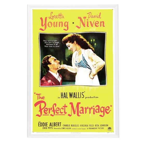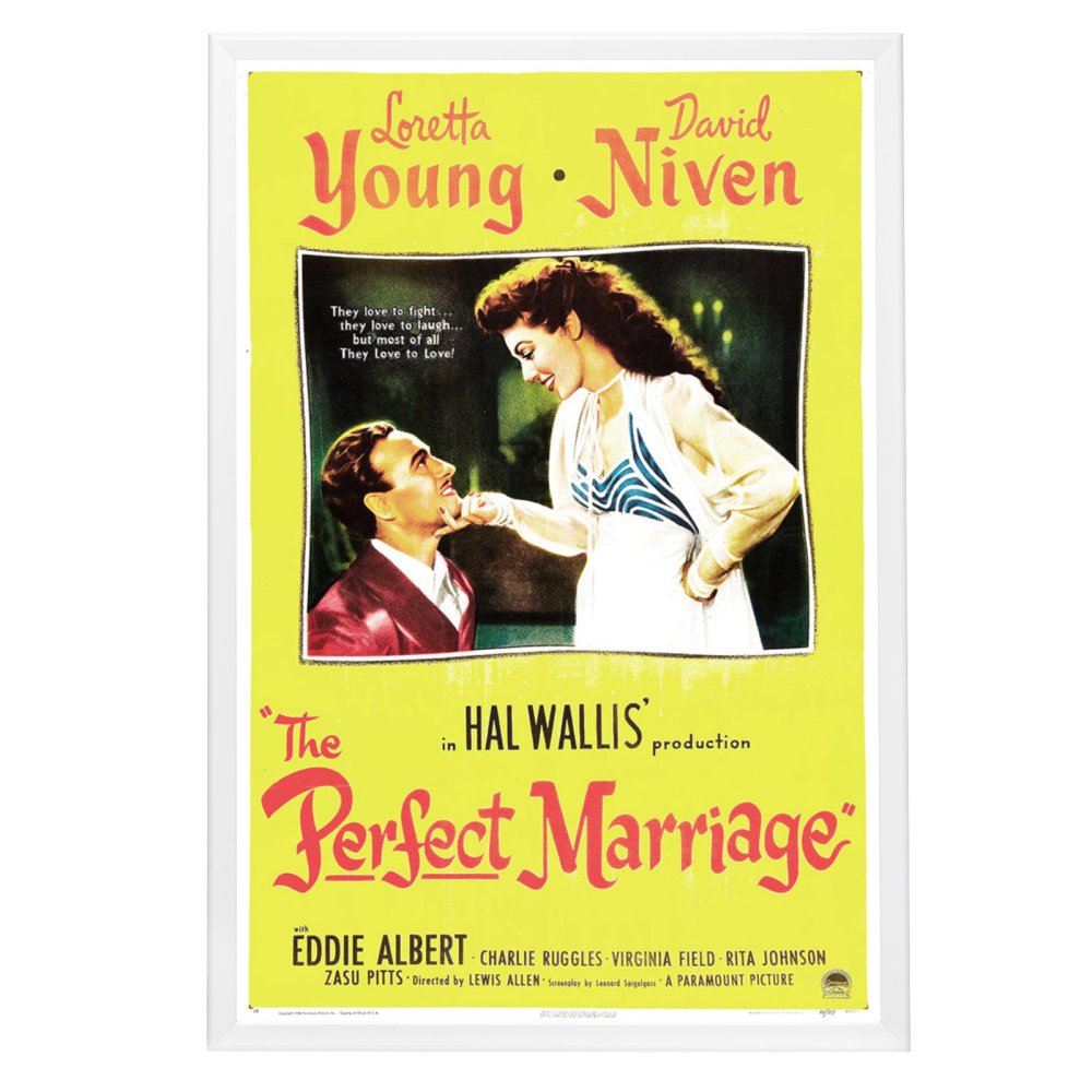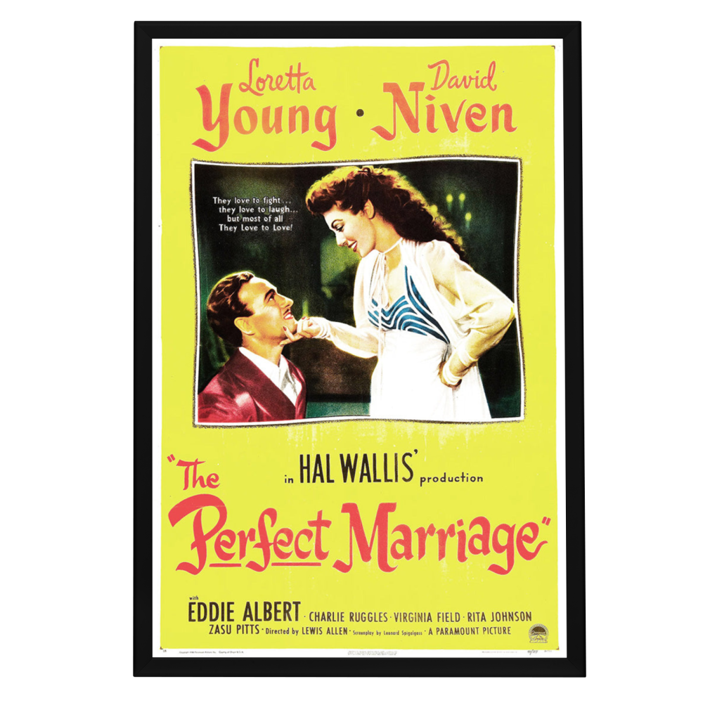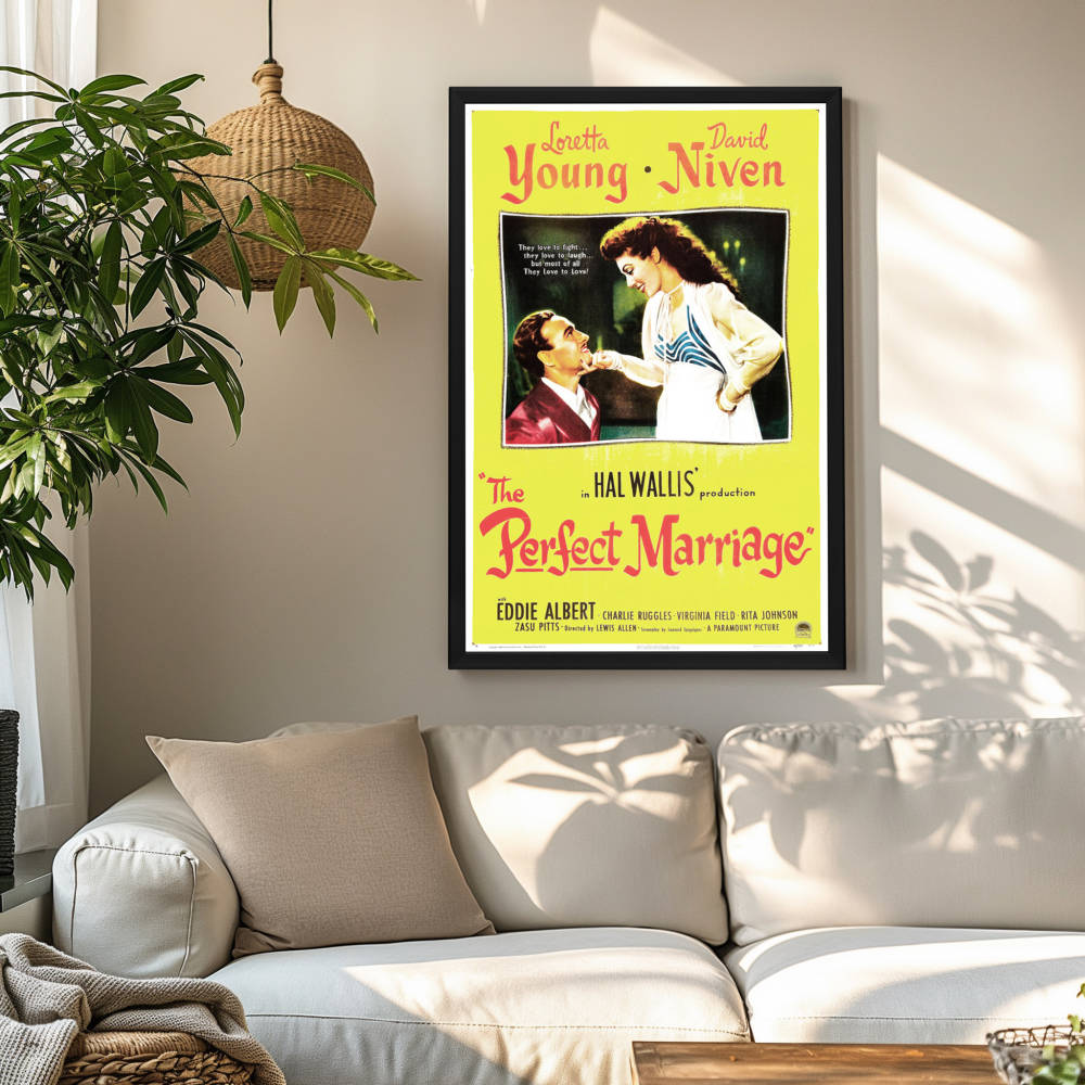 Step into a bygone era with the "Perfect Marriage" (1947) framed movie poster, a tribute to the Golden Age of Hollywood and an iconic piece of cinematic history. This film, starring the incomparable Loretta Young and the charming David Niven, is a classic romantic comedy that captured the hearts of post-war audiences with its playful dialogue and sophisticated humor.