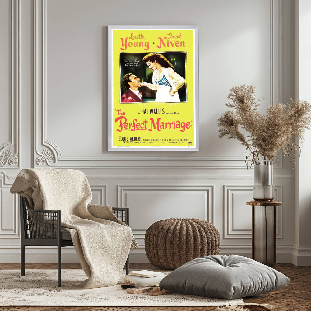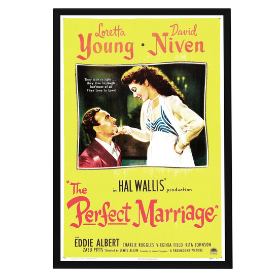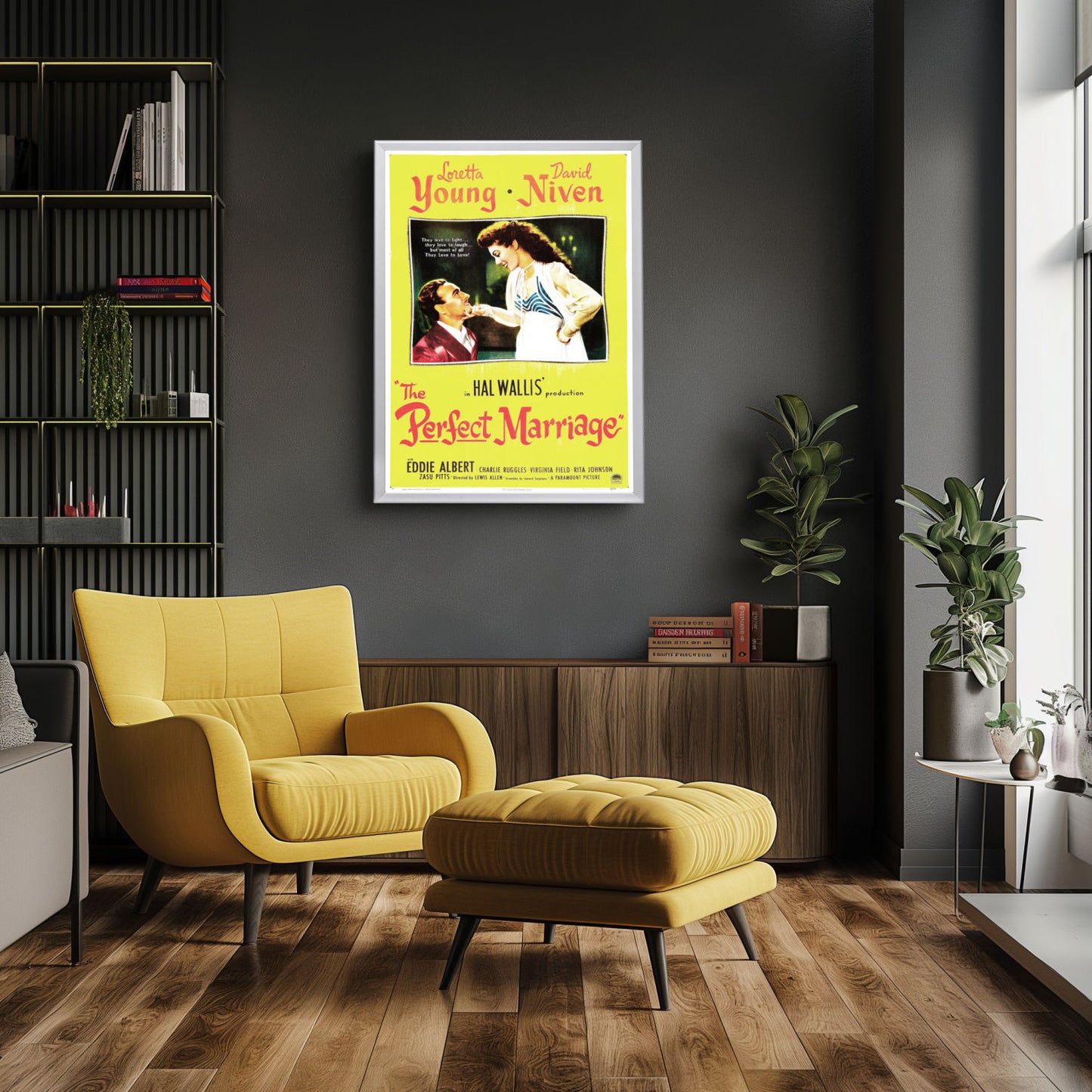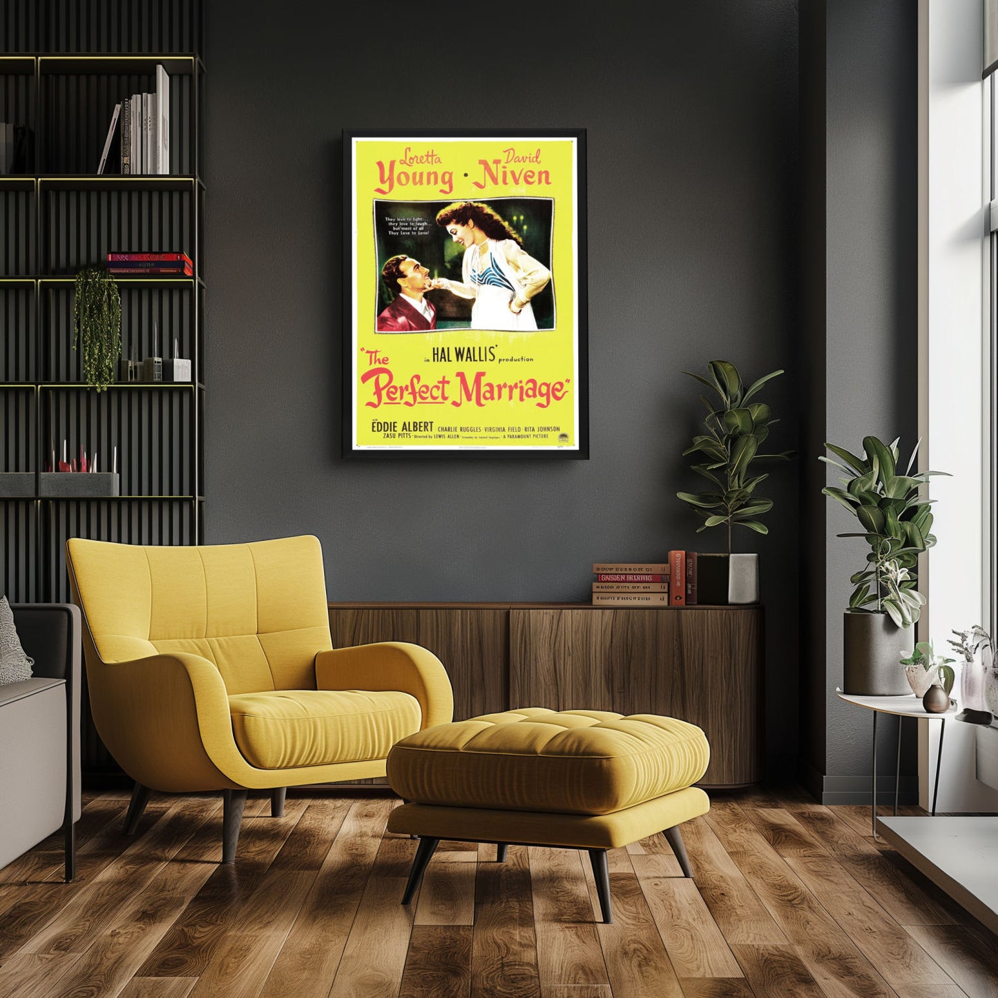 Step into a bygone era with the "Perfect Marriage" (1947) framed movie poster, a tribute to the Golden Age of Hollywood and an iconic piece of cinematic history. This film, starring the incomparable Loretta Young and the charming David Niven, is a classic romantic comedy that captured the hearts of post-war audiences with its playful dialogue and sophisticated humor.