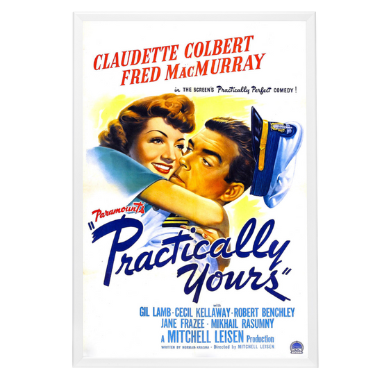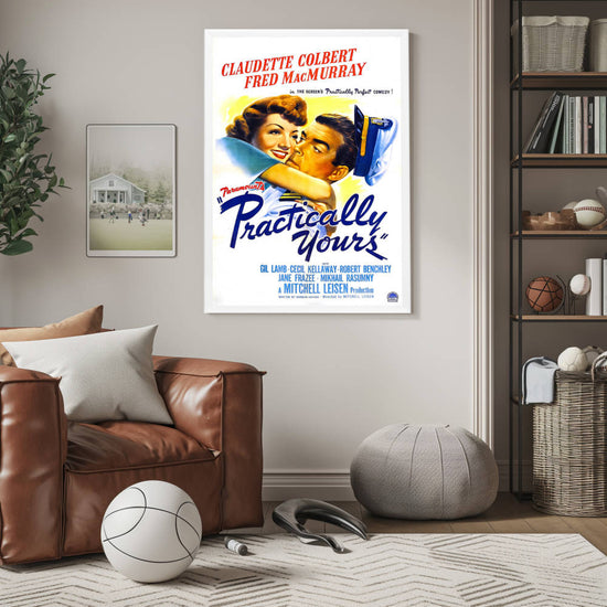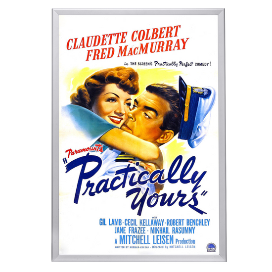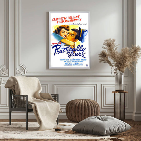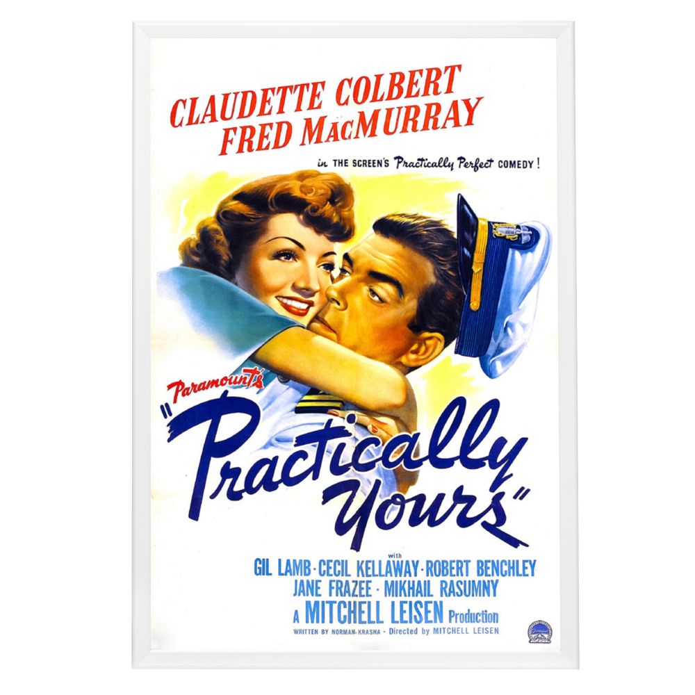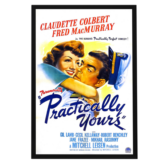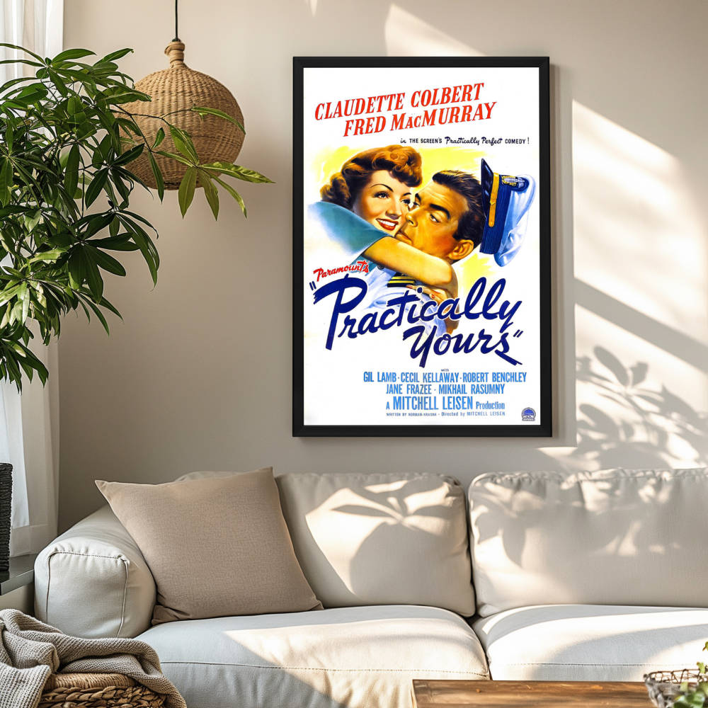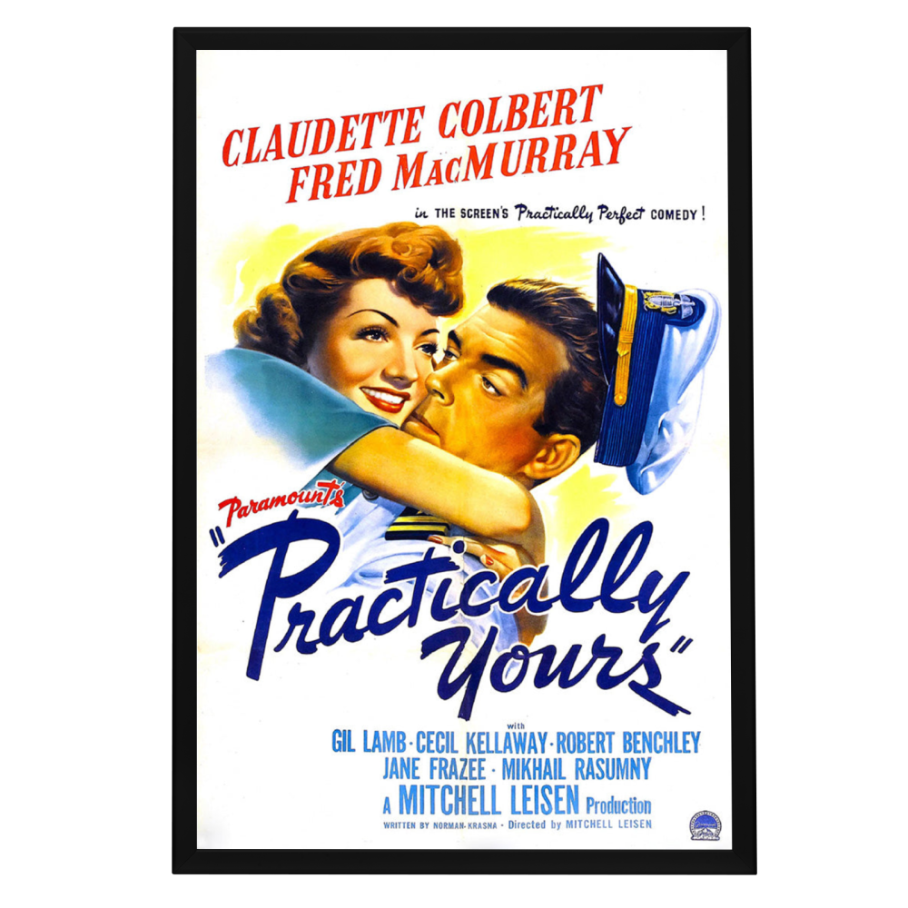 Immerse yourself in the charm of Golden Age cinema with the framed "Practically Yours" movie poster, a timeless piece of film history. This poster is a faithful high-quality reprint of the original that promoted the 1944 romantic comedy, featuring Claudette Colbert and Fred MacMurray, and directed by Mitchell Leisen. The poster, with its nostalgic artwork and vibrant color palette, instantly transports you back to an era when movie posters were not mere advertisements but an art form in themselves.