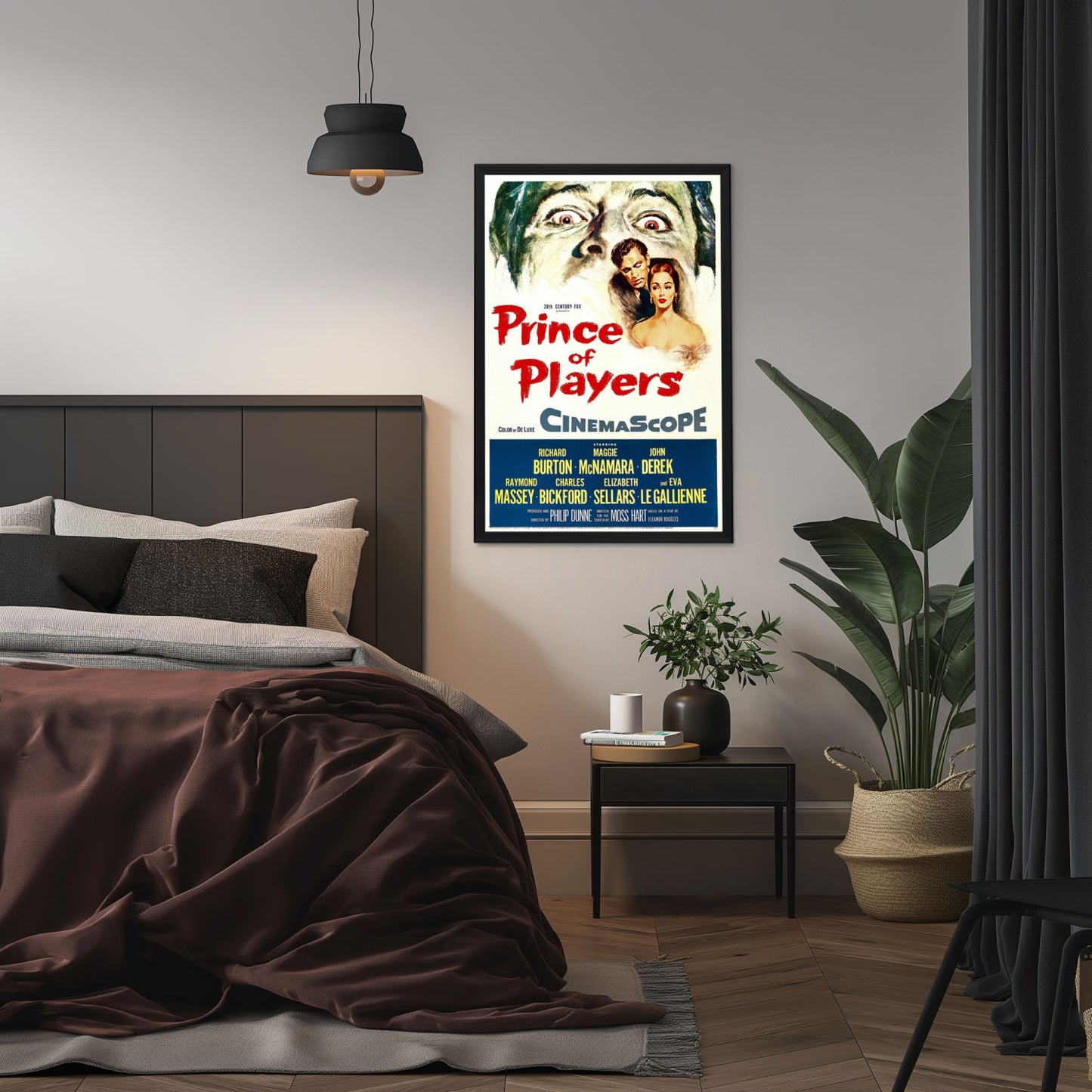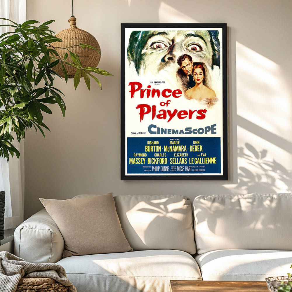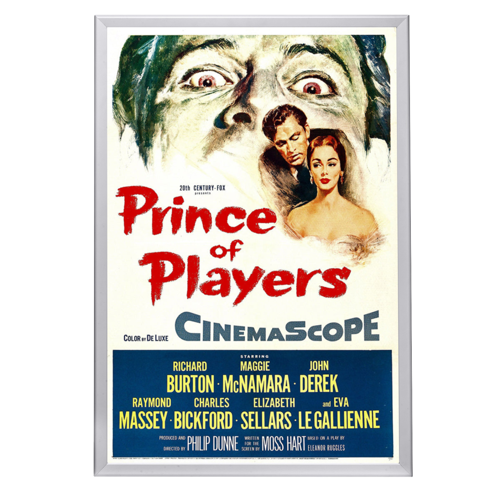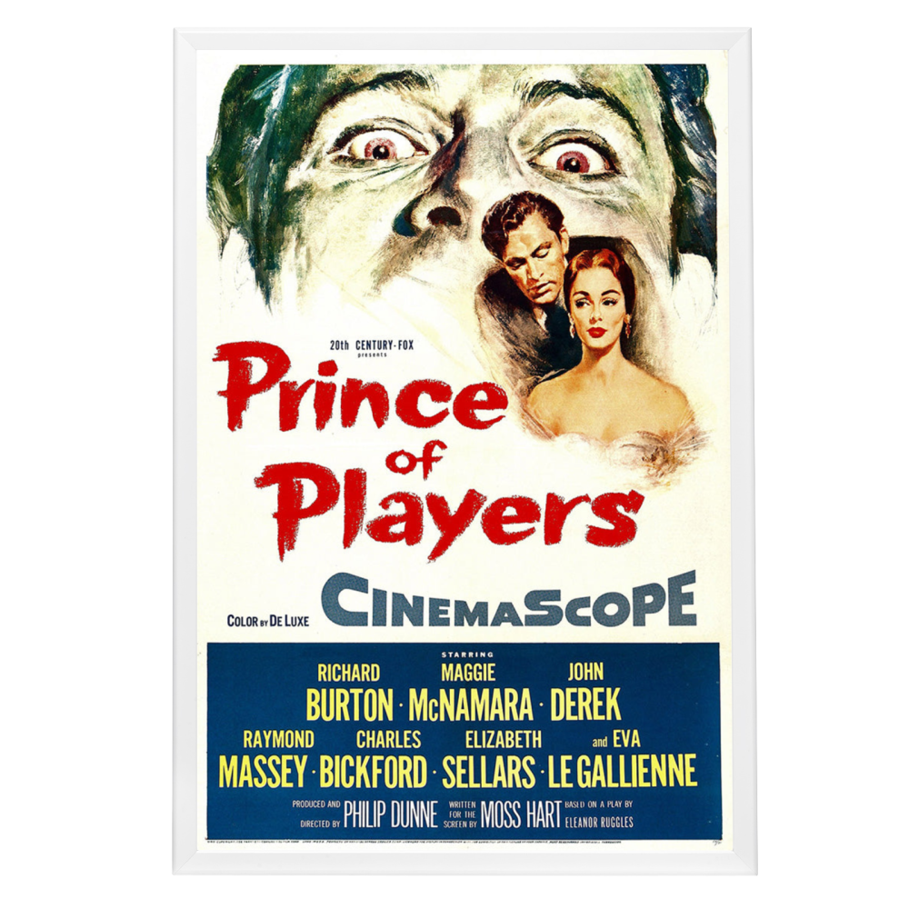 Celebrated for its striking visual appeal, the "Prince of Players" poster features a rich color palette that conveys the vibrancy of the theatrical world, along with the emotional depth of the film's narrative. The central image of Burton, with his intense gaze and period costume, draws the viewer into a bygone era of stage performance, making it an iconic item for collectors and enthusiasts of film history.