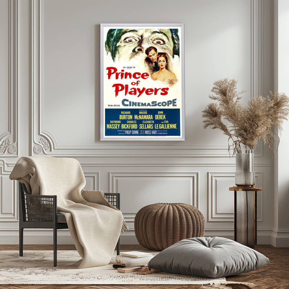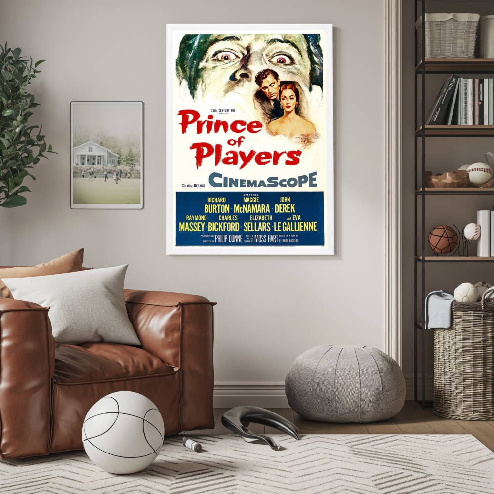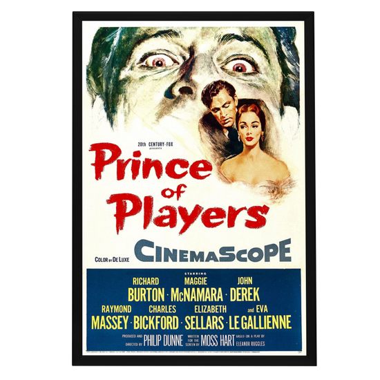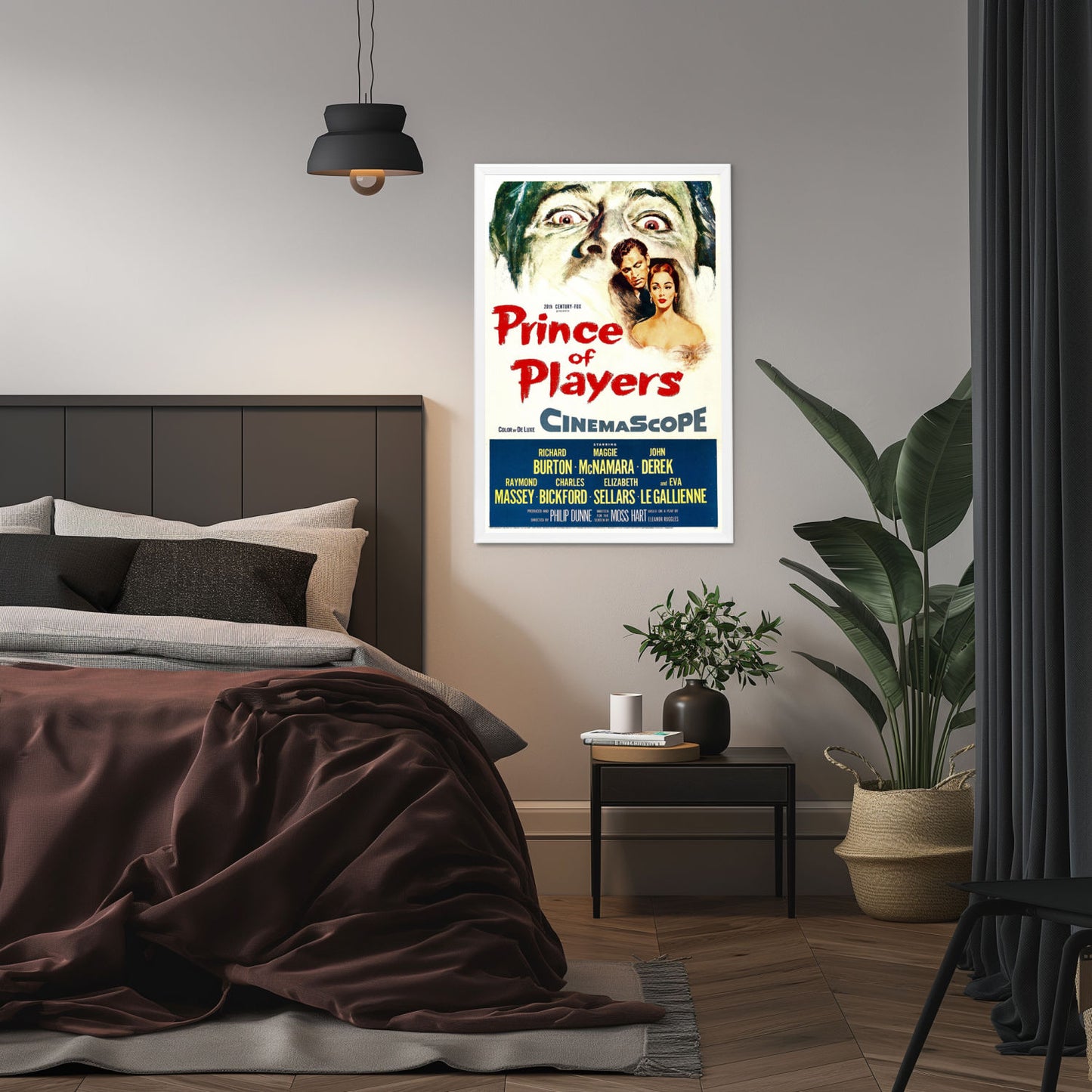 Celebrated for its striking visual appeal, the "Prince of Players" poster features a rich color palette that conveys the vibrancy of the theatrical world, along with the emotional depth of the film's narrative. The central image of Burton, with his intense gaze and period costume, draws the viewer into a bygone era of stage performance, making it an iconic item for collectors and enthusiasts of film history.