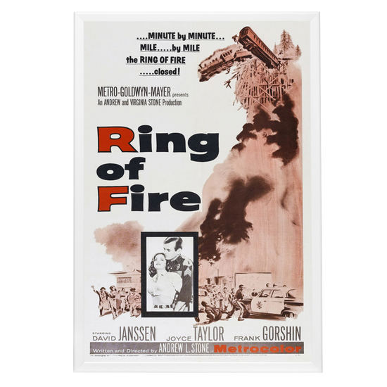 Immerse yourself in the cinematic legacy of "Ring of Fire" with this exquisite, high-quality reprint of the original 1961 movie poster. A visual testament to the dramatic intensity of Andrew L. Stone's groundbreaking film, this poster captures the raw emotion and peril that characterized the movie, setting it apart in the annals of thriller classics. The artwork, featuring the intense gaze of the movie's stars, David Janssen and Joyce Taylor, against a backdrop of roaring flames, is a nod to the suspenseful tale of an Oregon town threatened by a forest fire – an image sure to ignite the interest of film enthusiasts and art collectors alike.