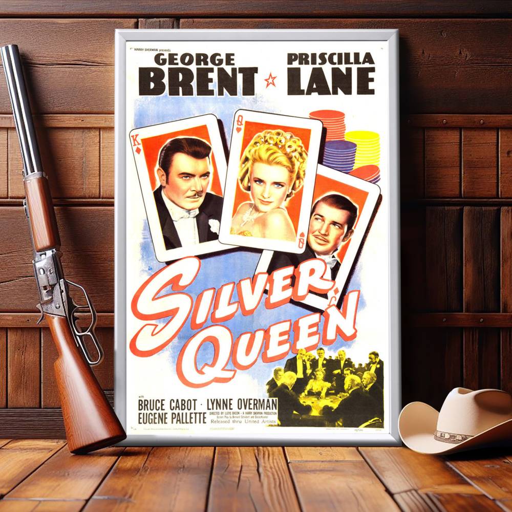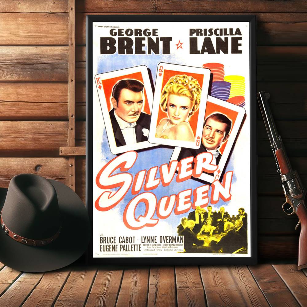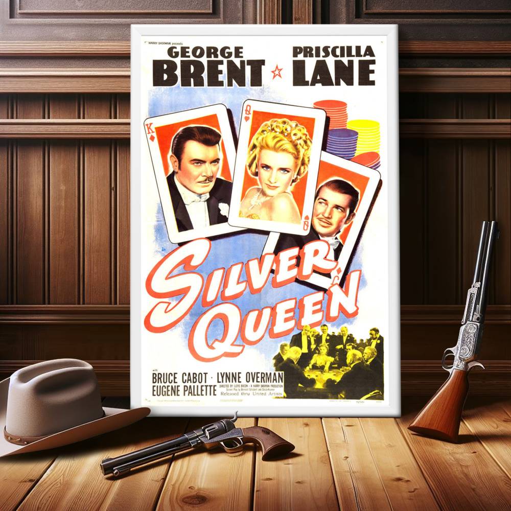Step back in time and adorn your walls with a piece of cinematic history with the "Silver Queen (1942)" framed movie poster. Highly sought after, this poster captures the allure of classic Hollywood cinema, featuring the magnetic George Brent and the vivacious Priscilla Lane who starred in this dramatic Western film. The film, cherished for its heady mix of romance and adventure, spun a tale of love, betrayal, and redemption during the raucous days of the California Gold Rush.