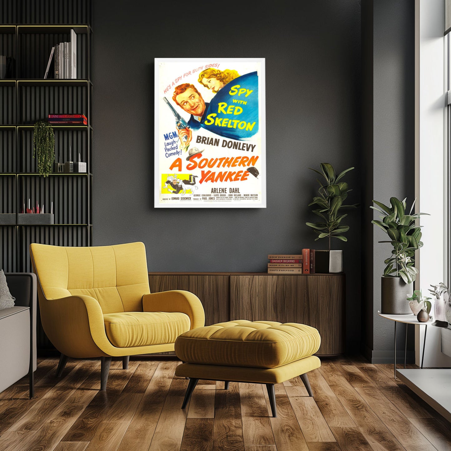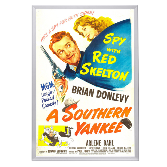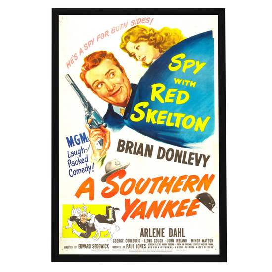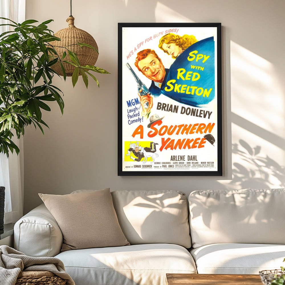 Experience a slice of classic Hollywood with our framed reproduction of the "A Southern Yankee" (1948) movie poster. This delightful comedy, featuring the inimitable Red Skelton and directed by the acclaimed Edward Sedgwick, still captivates audiences with its blend of slapstick humor and Civil War espionage satire. The poster itself is an emblem of its era, emblazoned with vibrant, hand-painted visuals that telegraph the film's lighthearted approach to a historical setting.