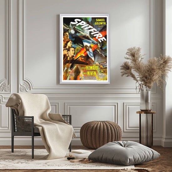 Proudly display this high-quality reprint of the "Spitfire" poster, which has been meticulously produced to preserve the original artwork's integrity and vibrant colors. The visual appeal of this piece is undeniable, with its dramatic depiction of a Spitfire soaring majestically above the clouds, evoking a sense of courage and determination. The poster's vintage design, featuring bold typography and period-specific graphic elements, conjures up nostalgia and admiration for a bygone era of filmmaking and aviation prowess.