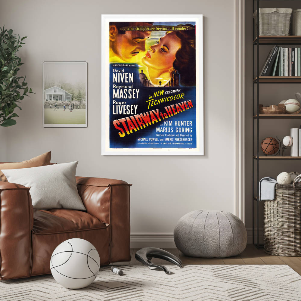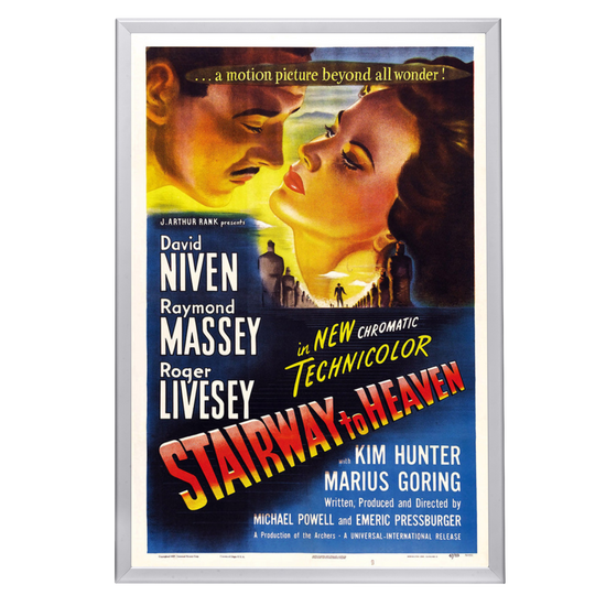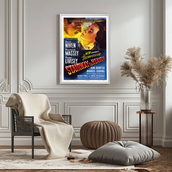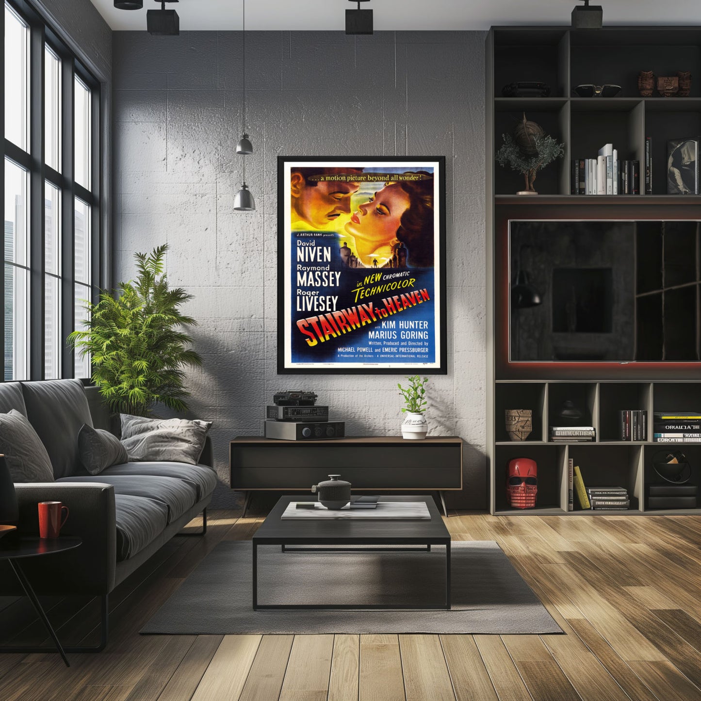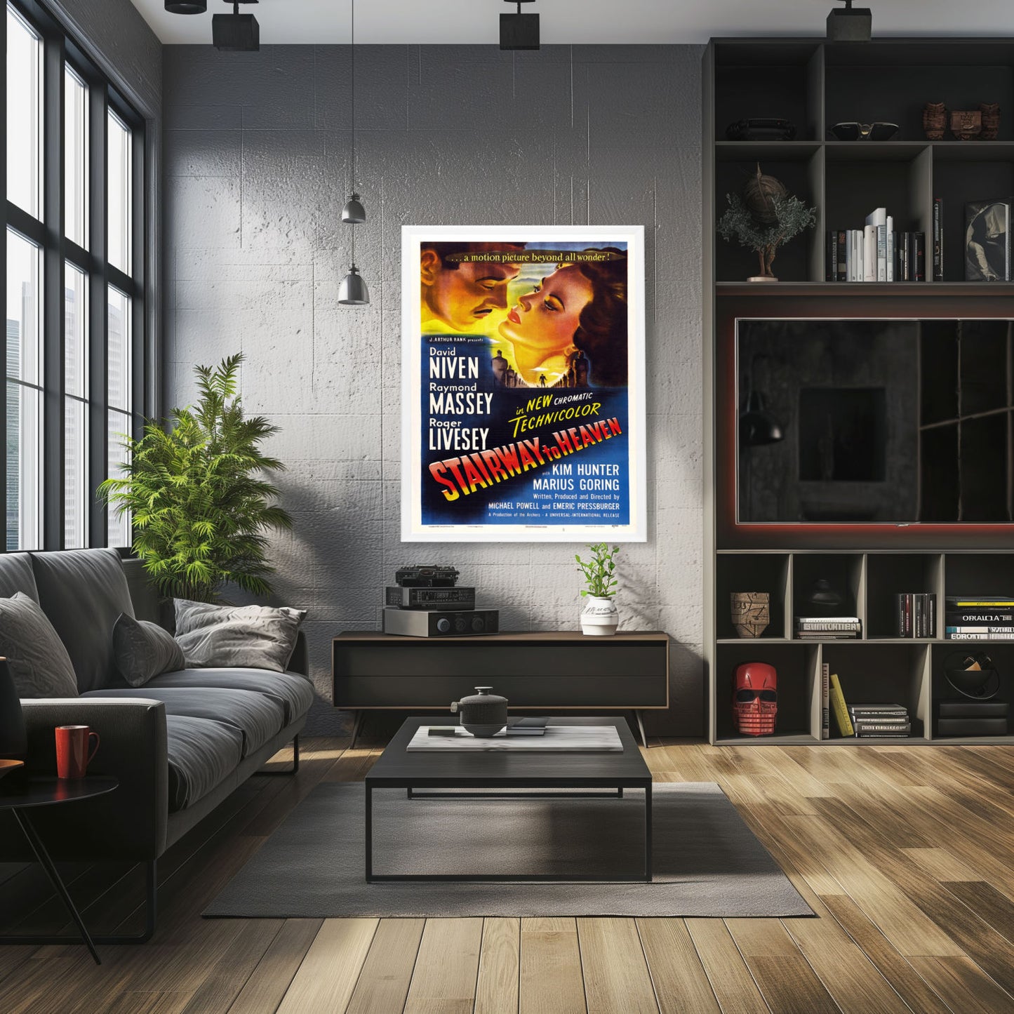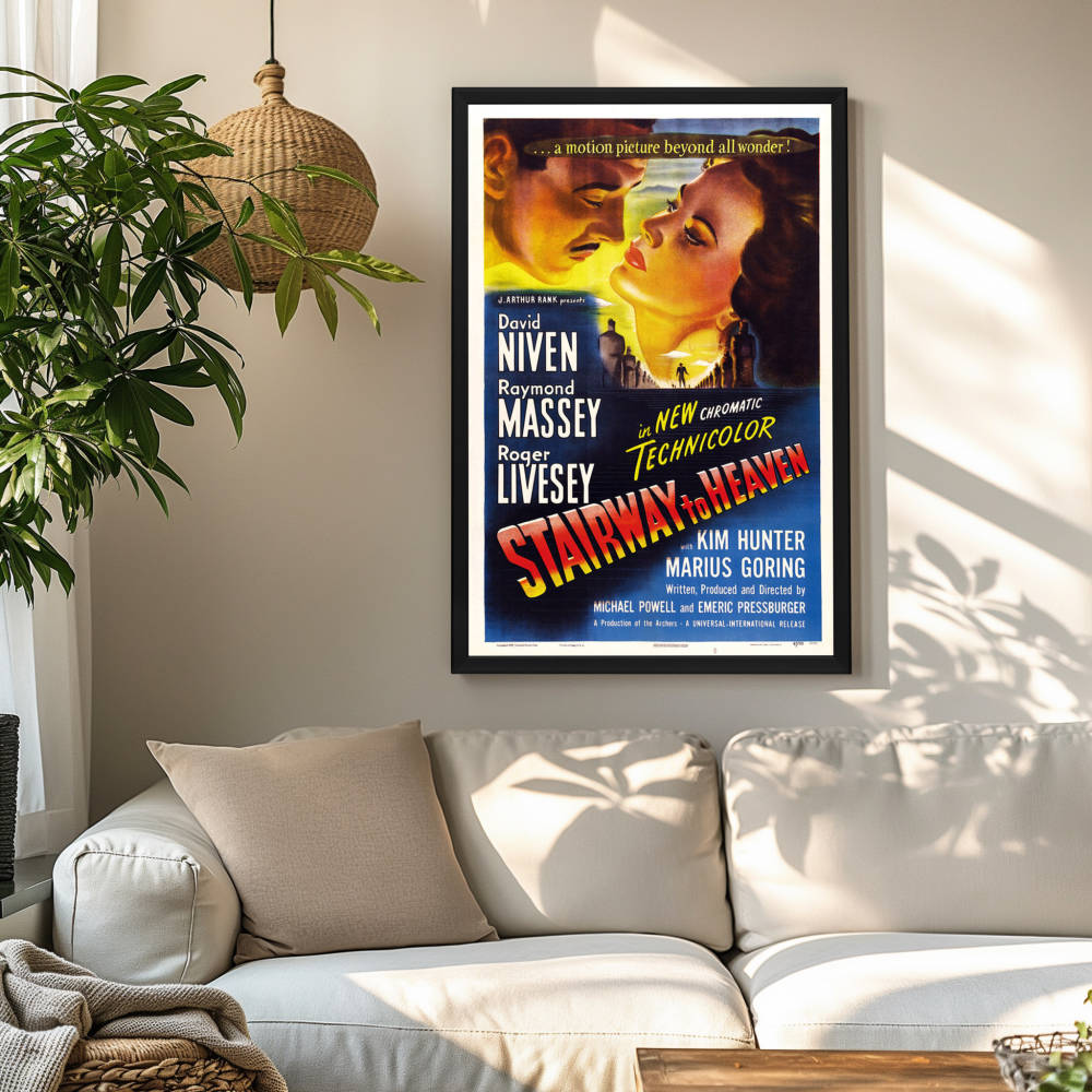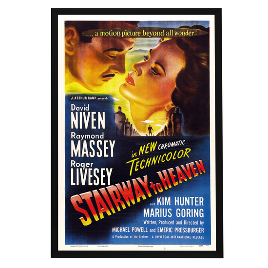 Immerse yourself in the classic charm and celestial allure of the "Stairway to Heaven" (1946) framed movie poster, a visual testament to the golden era of filmmaking. Directed by the esteemed Michael Powell and Emeric Pressburger, this film, known in the UK as "A Matter of Life and Death," is more than just a cinematic gem—it's a piece of cinematic history captured in a stunning, high-quality reprint that pays homage to the film's original theatrical release artwork.