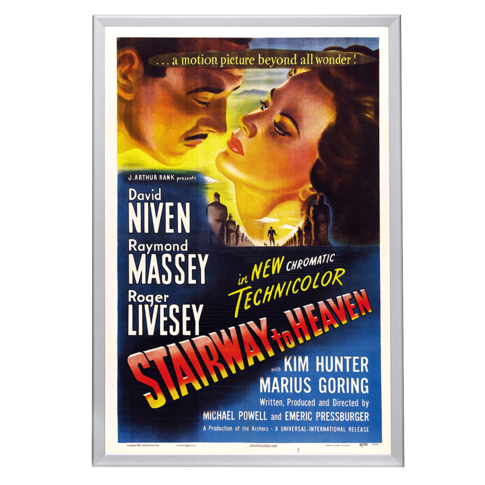 Own the 1946 "Stairway to Heaven" framed poster, a high-quality reprint in a clear, antiglare Snapezo frame. Iconic art meets professional preservation.