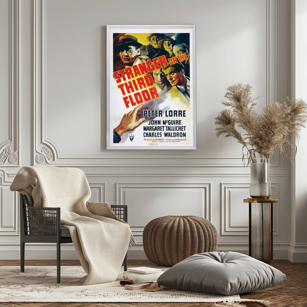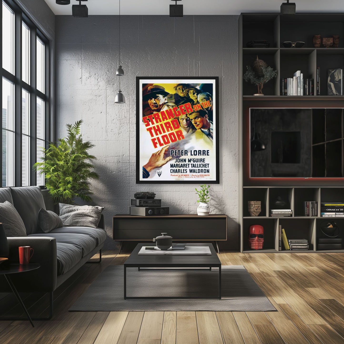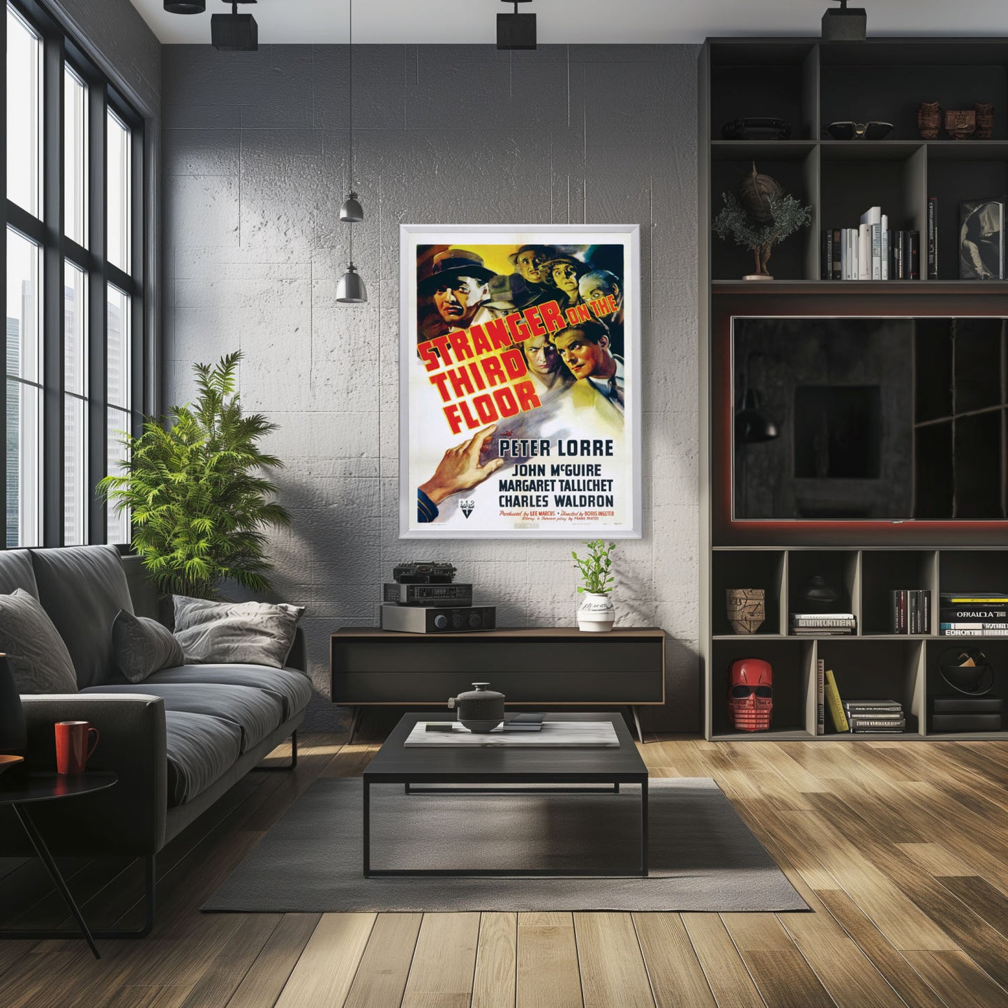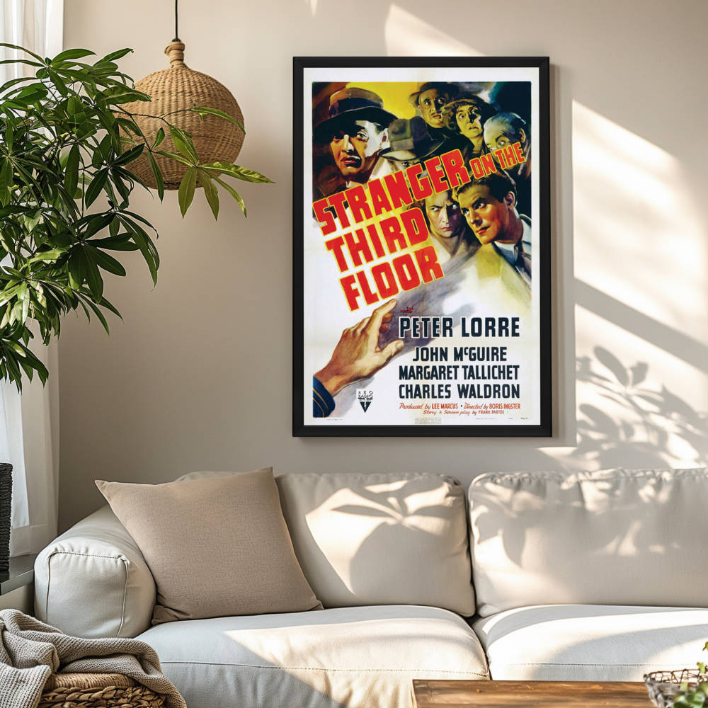 Enhance your space with a piece of cinematic history – the iconic "Stranger on the Third Floor" (1940) movie poster, artfully encased in a premium Snapezo Professional Movie Poster Frame. This gripping film noir classic, recognized as one of the earliest exemplars of the genre, features Peter Lorre in a performance that has captivated audiences and critics alike for decades. The movie's stylistic elements and Lorre's portrayal set the standard for noir and have since influenced countless films.