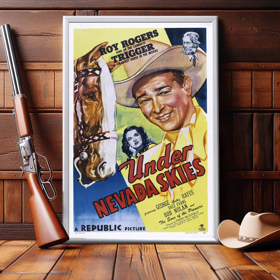 Under Nevada Skies, a 1946 classic western film, features iconic stars such as Roy Rogers, Trigger, and Dale Evans. This particular movie poster captures the essence of a bygone era in filmmaking, when cowboy heroes and their trusted steeds were the crown jewels of the silver screen. The artwork, a masterpiece of vintage cinema promotion, vividly depicts the action and adventure that encapsulate the film's storyline.