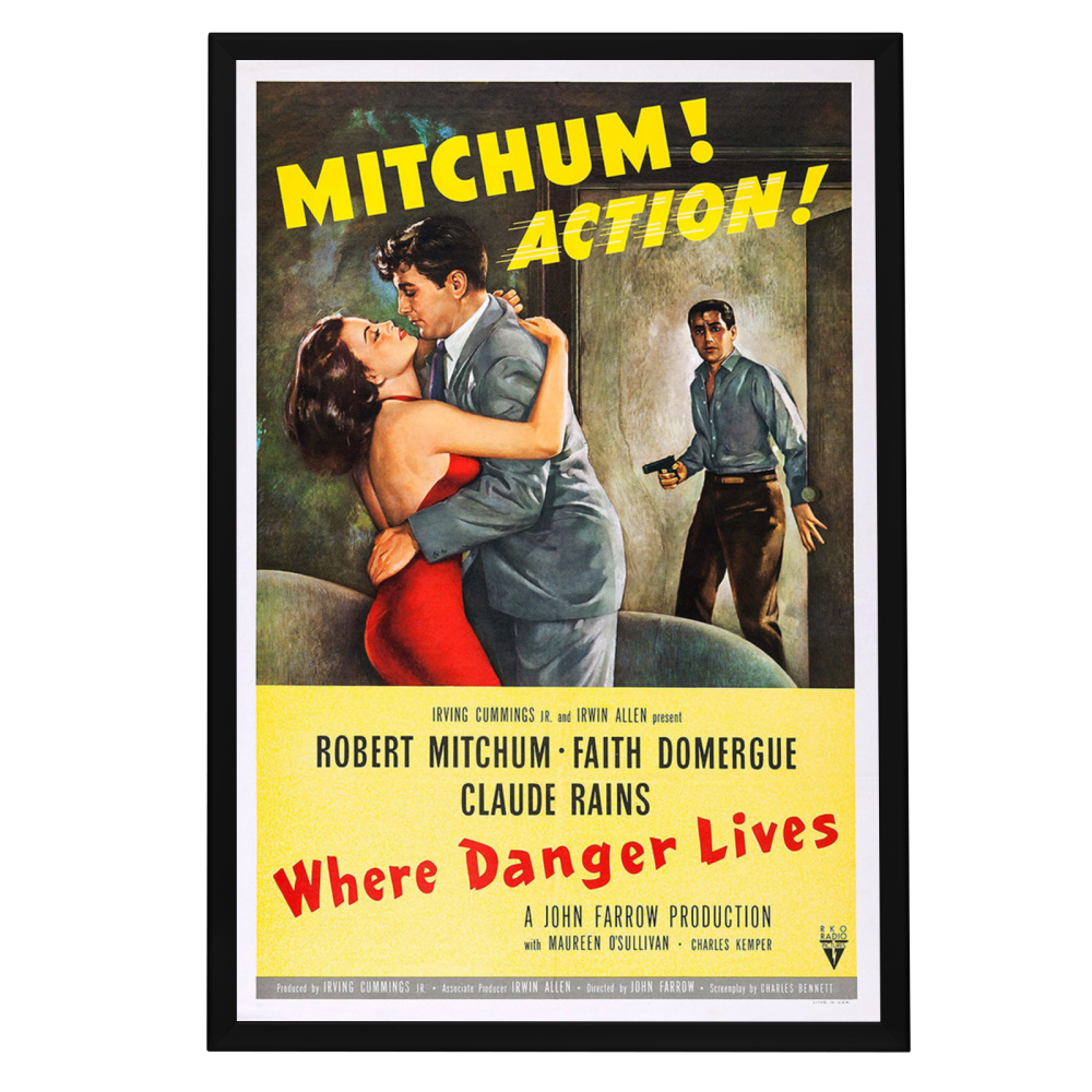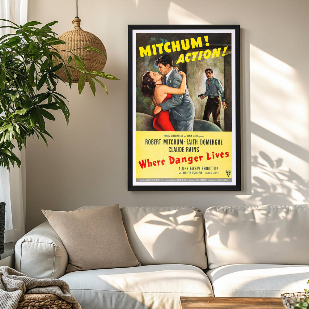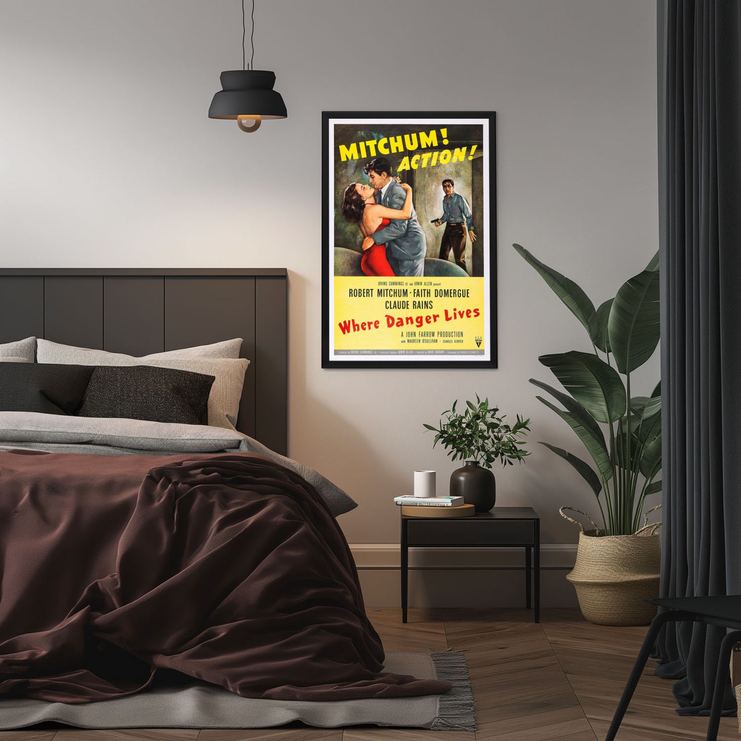Step into a classic world of suspense with our framed "Where Danger Lives" movie poster, an exceptional tribute to the 1950 noir thriller that had audiences on the edge of their seats. Directed by John Farrow and featuring the hypnotic presence of Robert Mitchum alongside the captivating Faith Domergue, this film is a forgotten gem that stirred the film-noir genre with its dark narrative and stylish cinematography.