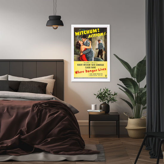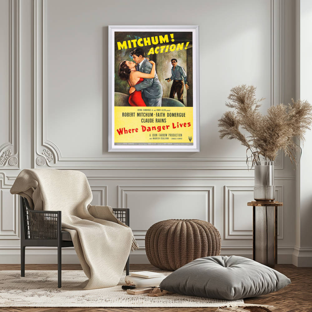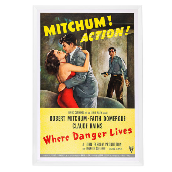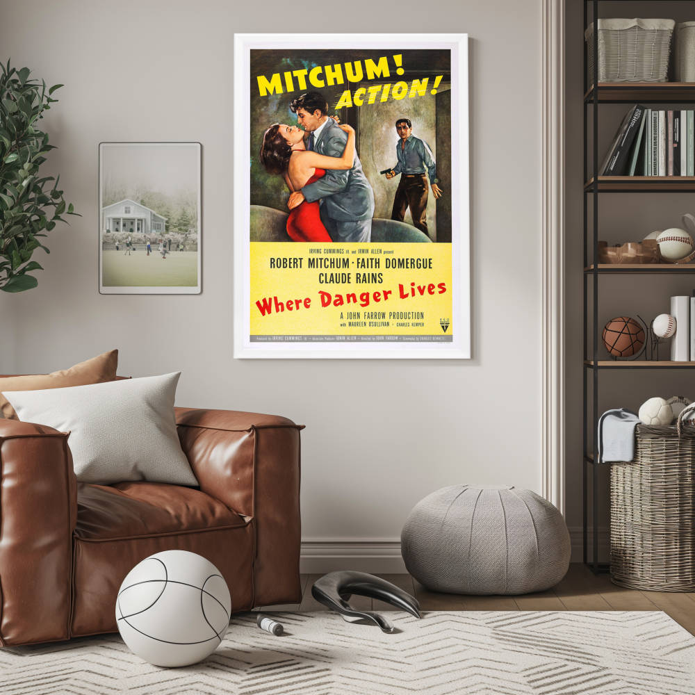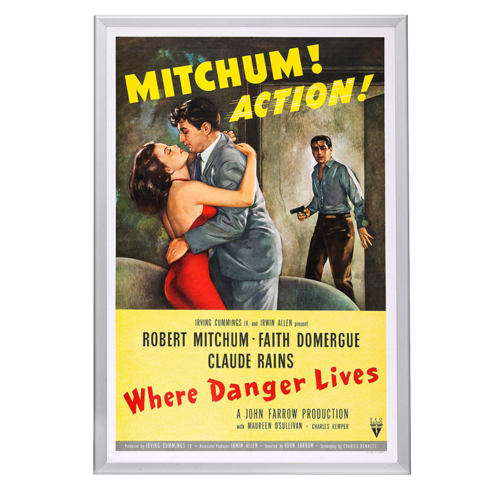 Step into a classic world of suspense with our framed "Where Danger Lives" movie poster, an exceptional tribute to the 1950 noir thriller that had audiences on the edge of their seats. Directed by John Farrow and featuring the hypnotic presence of Robert Mitchum alongside the captivating Faith Domergue, this film is a forgotten gem that stirred the film-noir genre with its dark narrative and stylish cinematography.