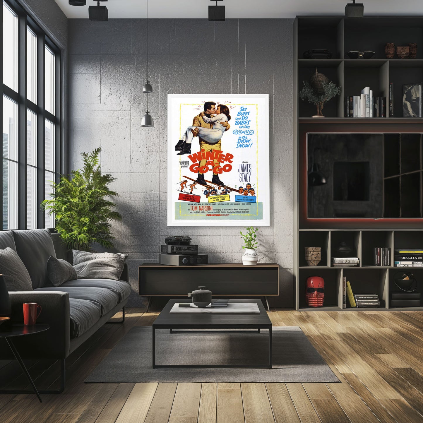 The "Winter A-Go-Go" poster captures the essence of the film's upbeat tempo, featuring iconic imagery of joyful skiers against a backdrop of snow-capped mountains, embodying the winter party scene. This high-quality reprint is far from a mere digital print; it exudes the charm of a carefully produced replica that maintains the original's color richness and graphic appeal.